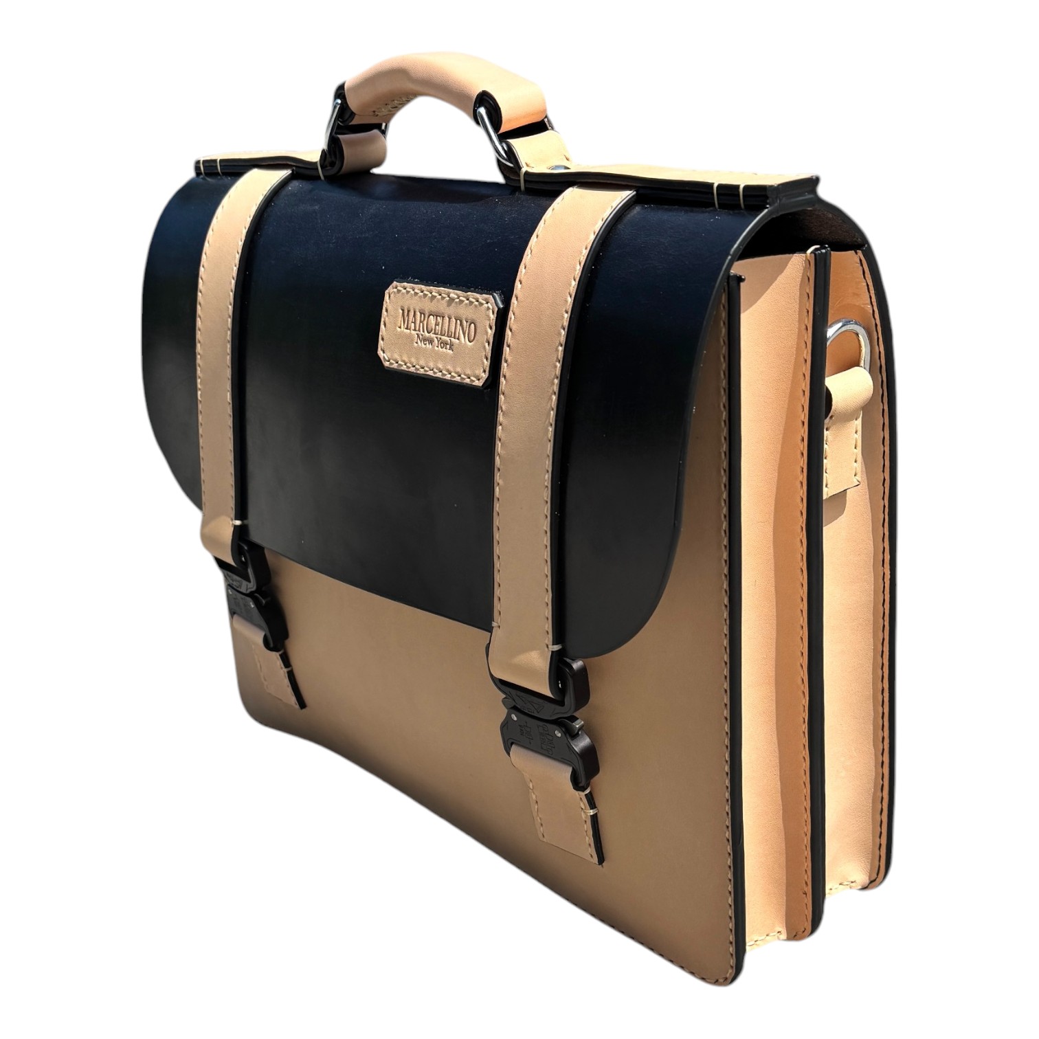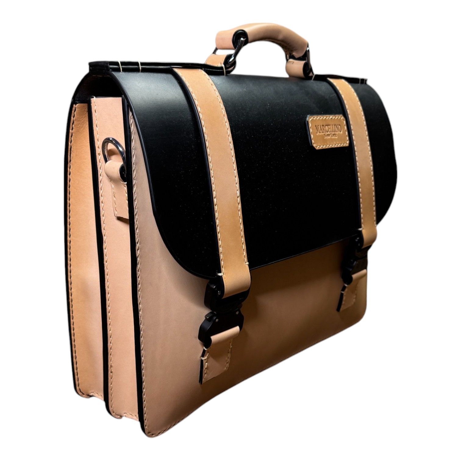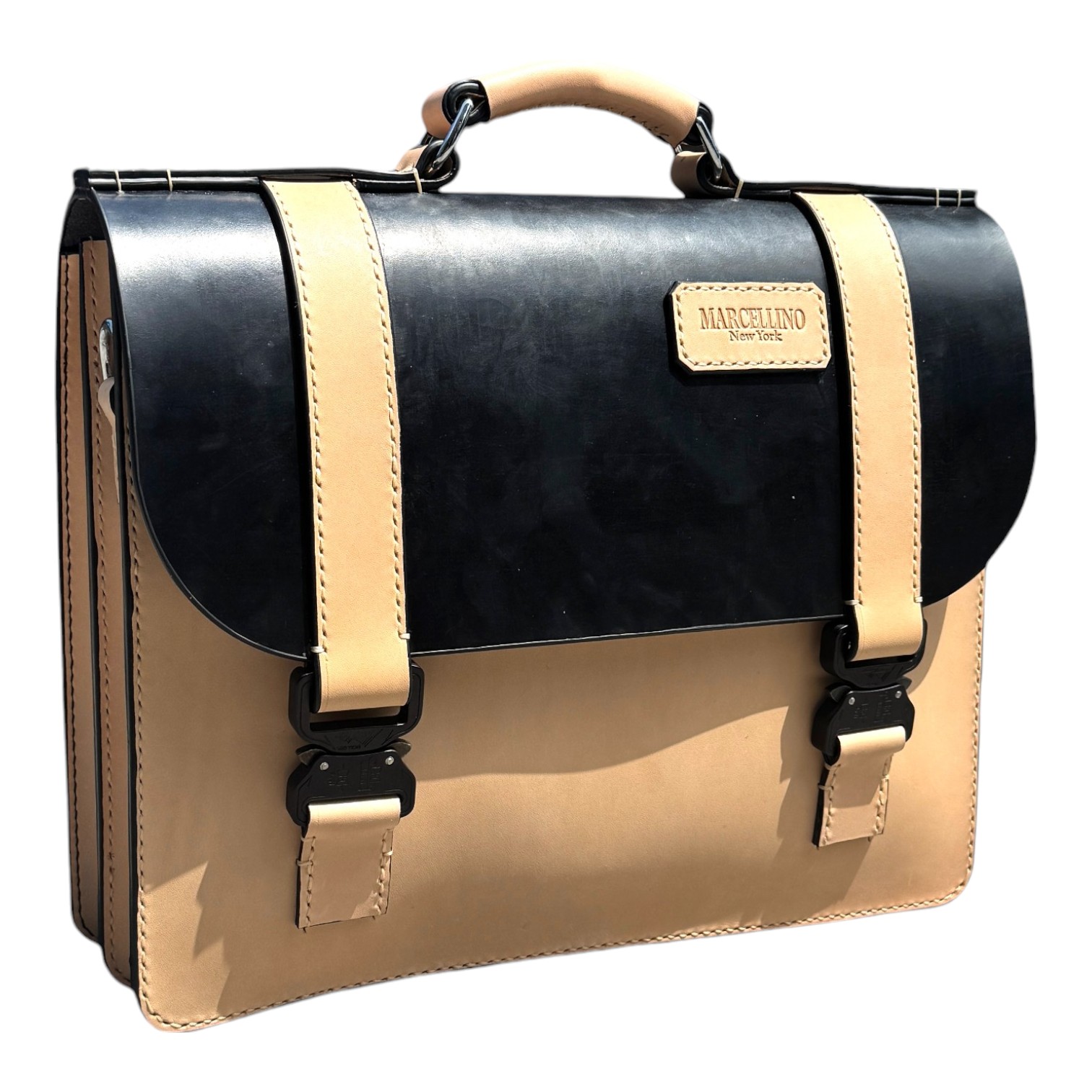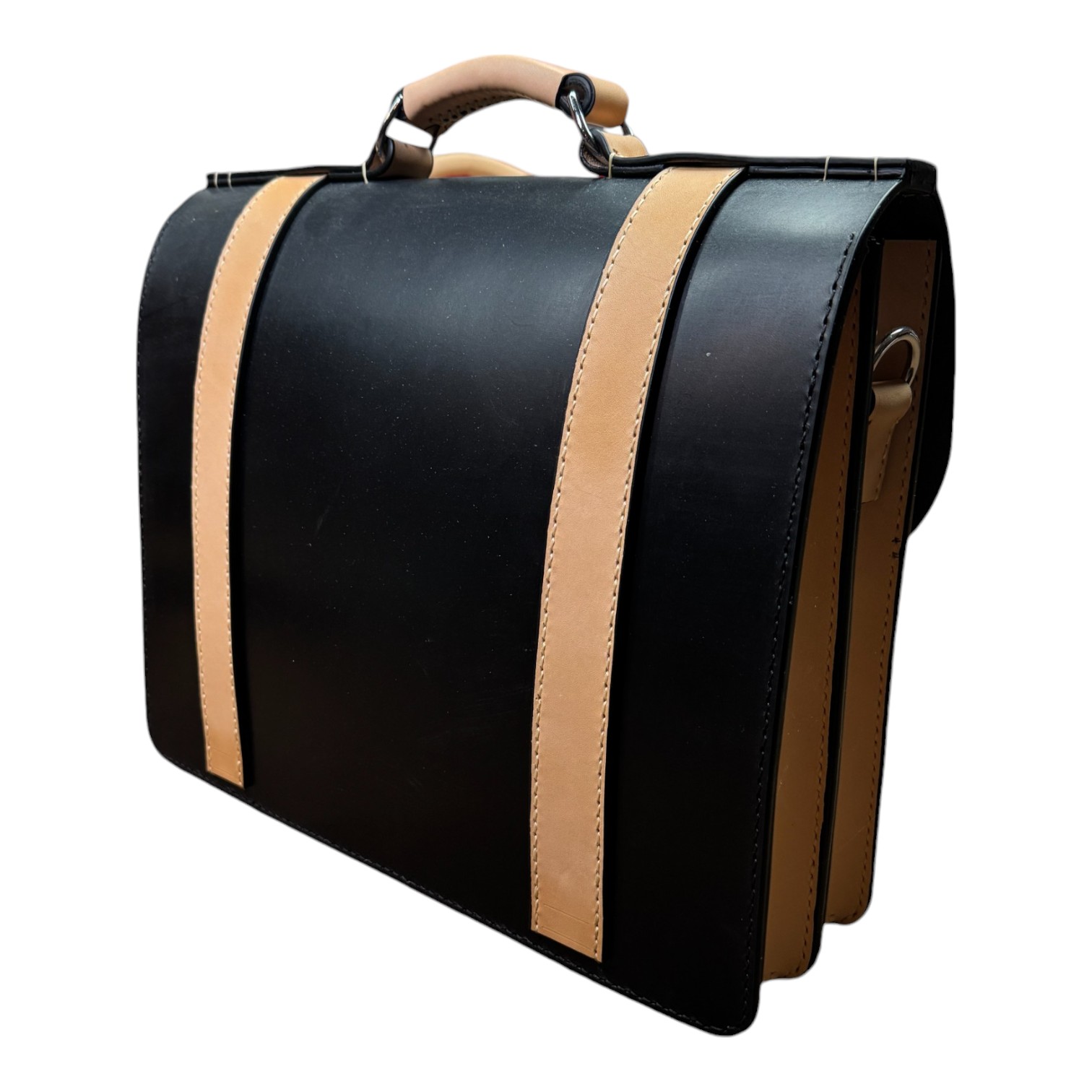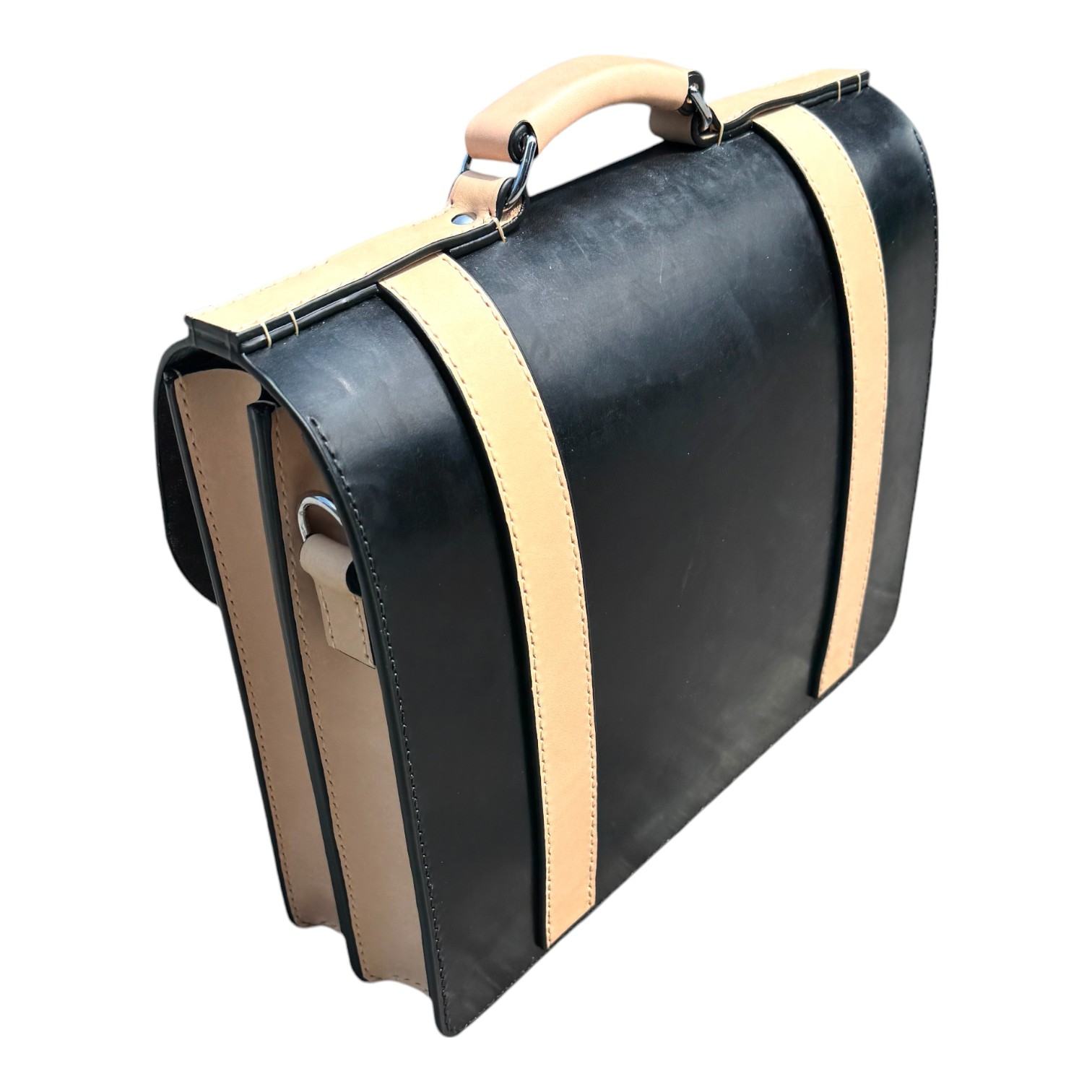 This briefcase is made from Natural Vegetable Tanned and Black UK English bridle leather