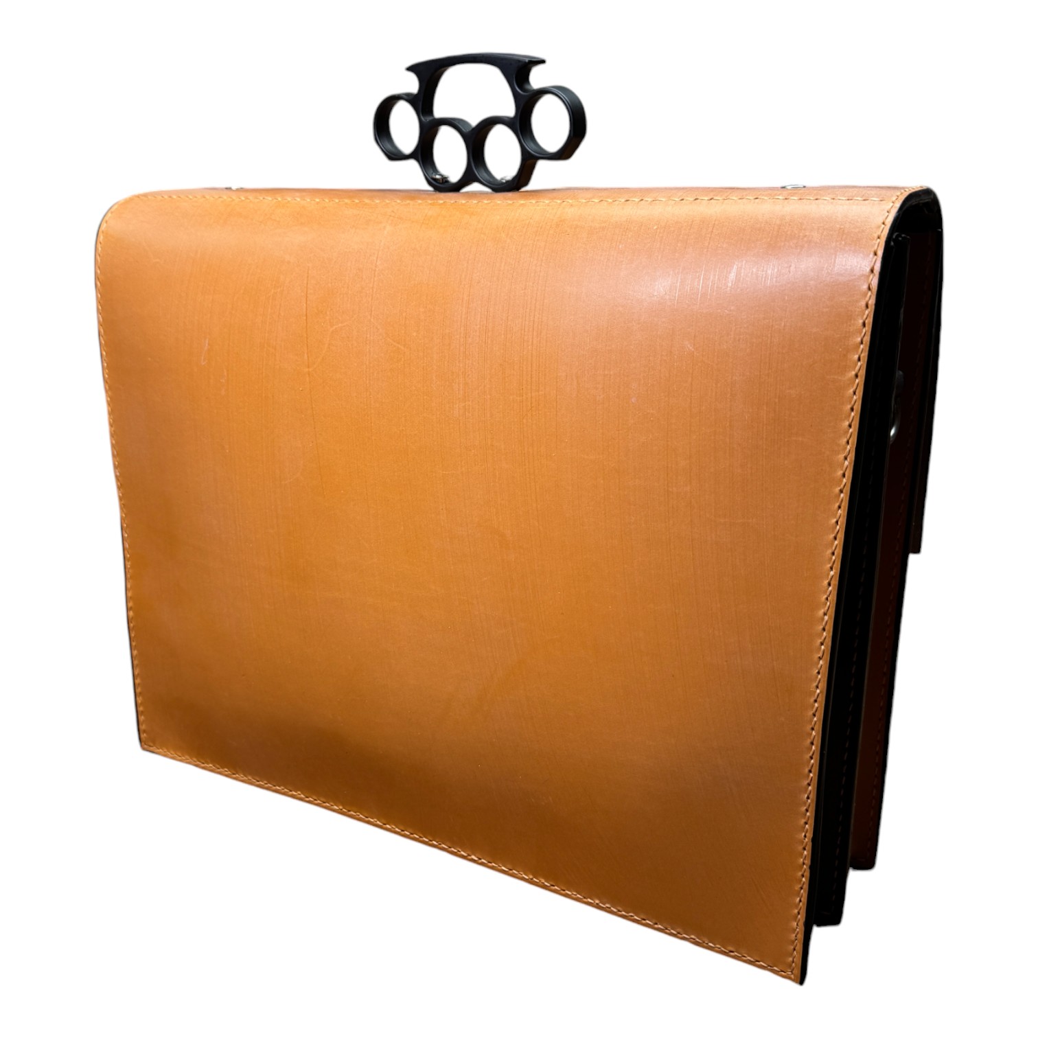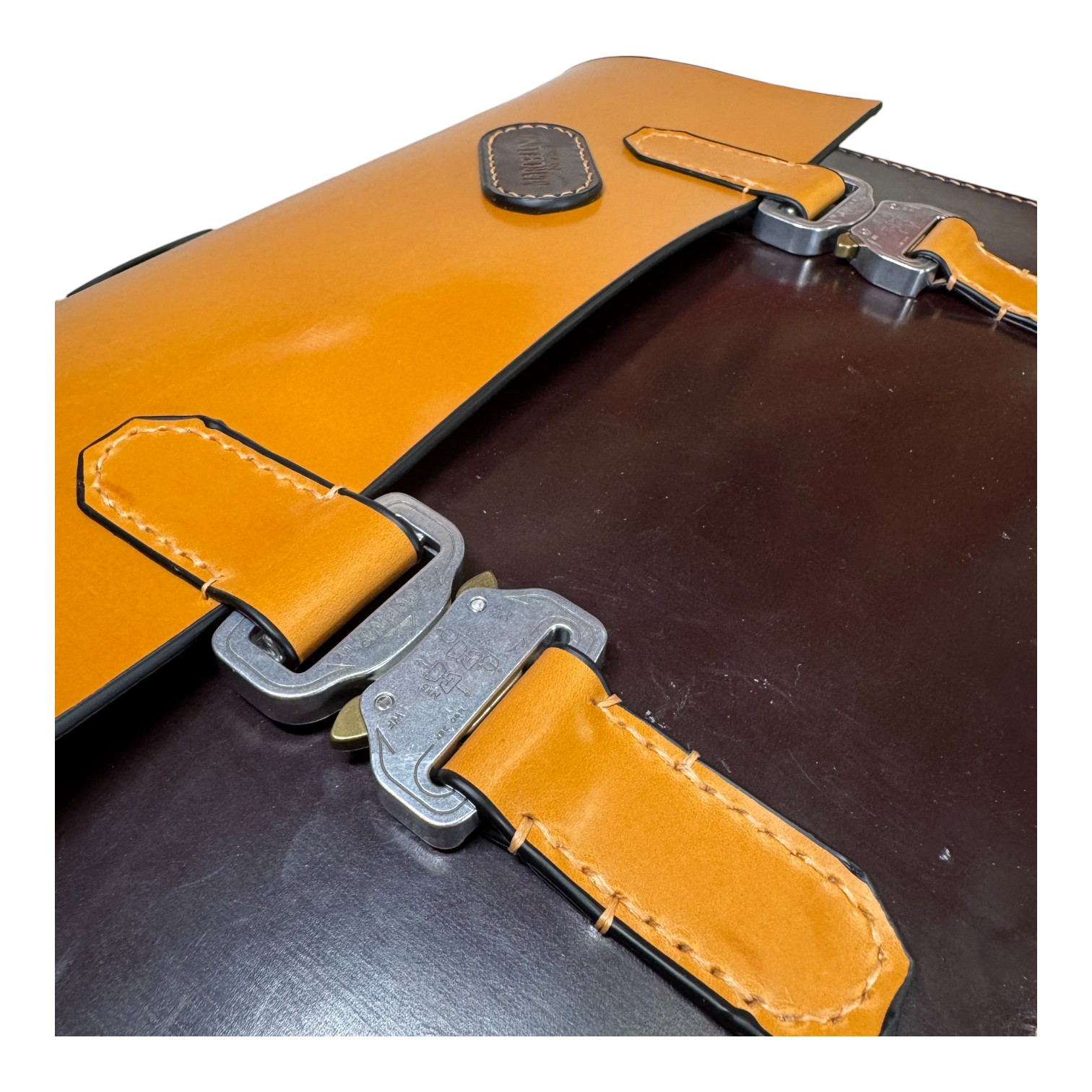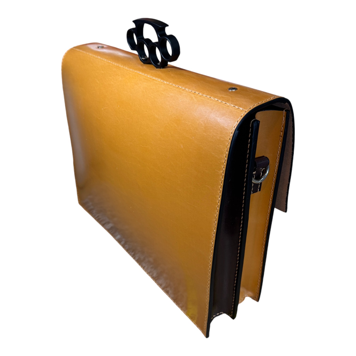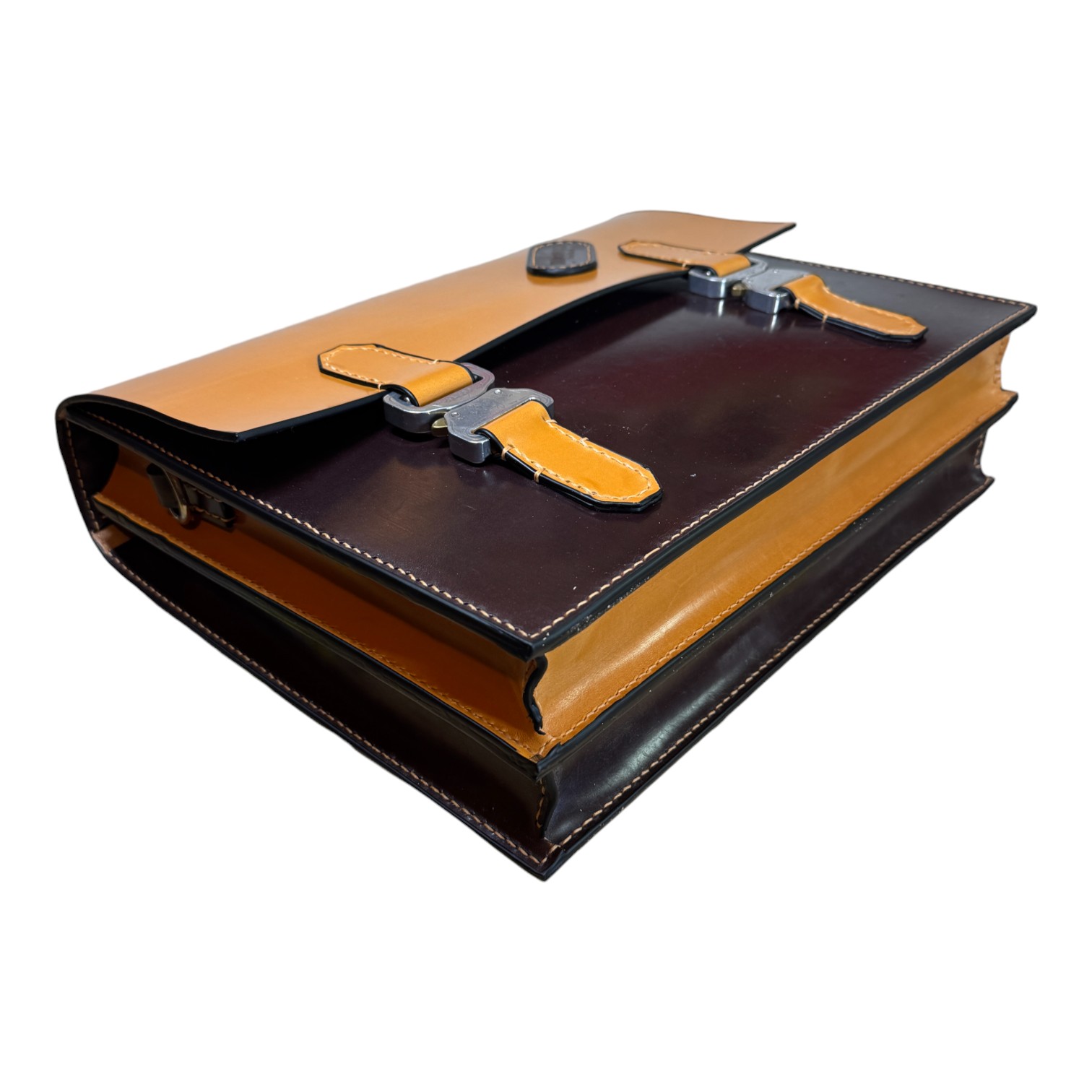 This briefcase is made from Burgundy and London Tan UK English bridle leather and a solid steel knuckle handle