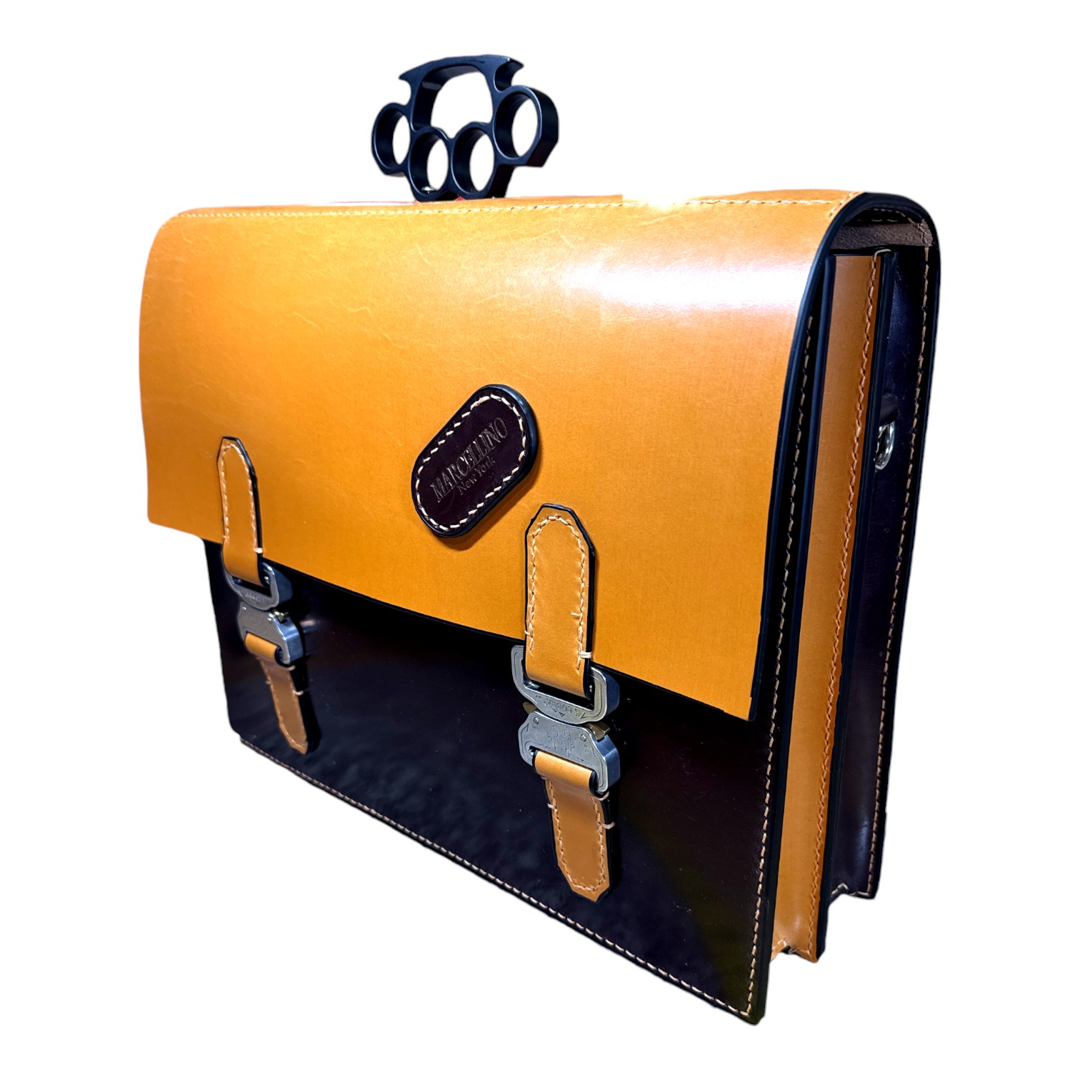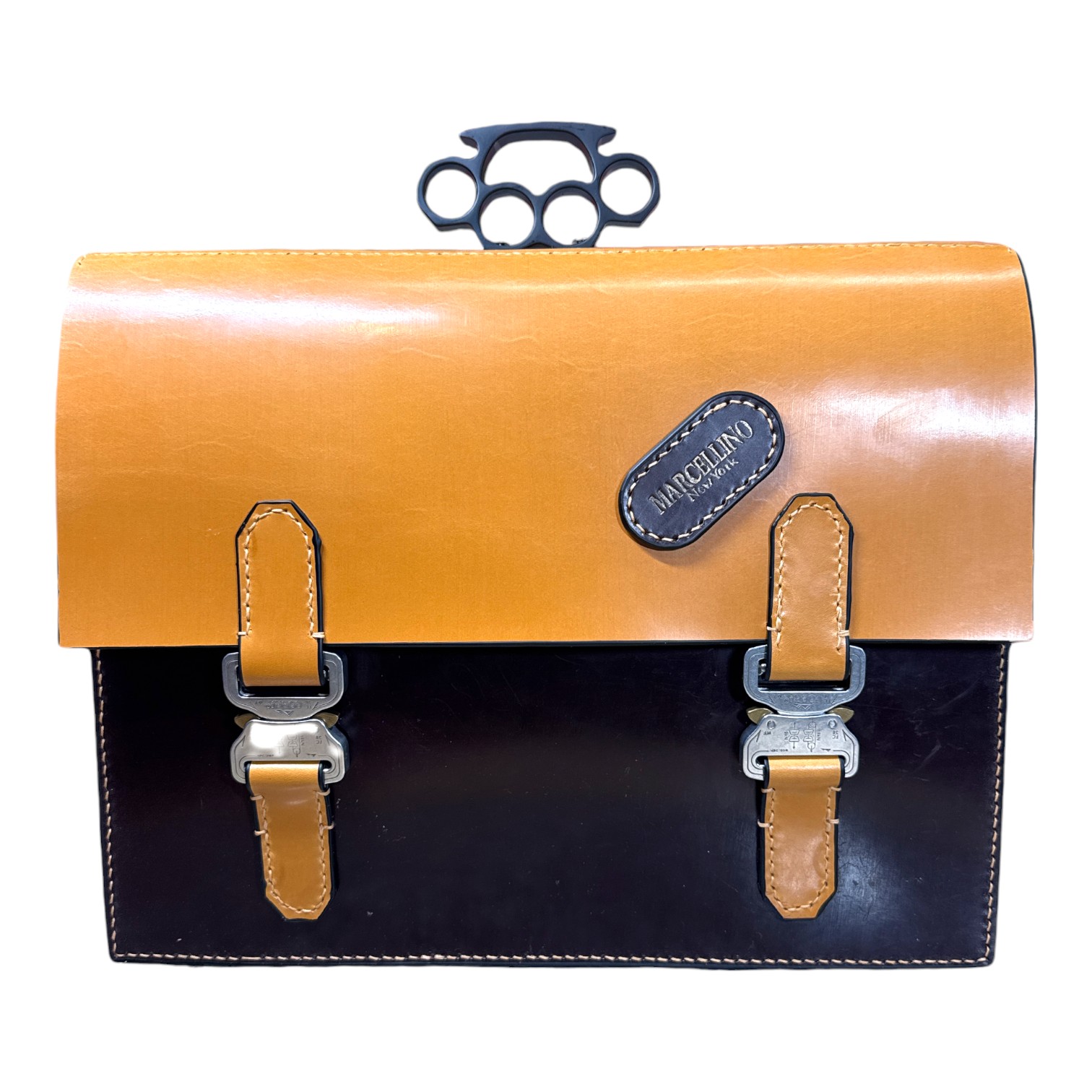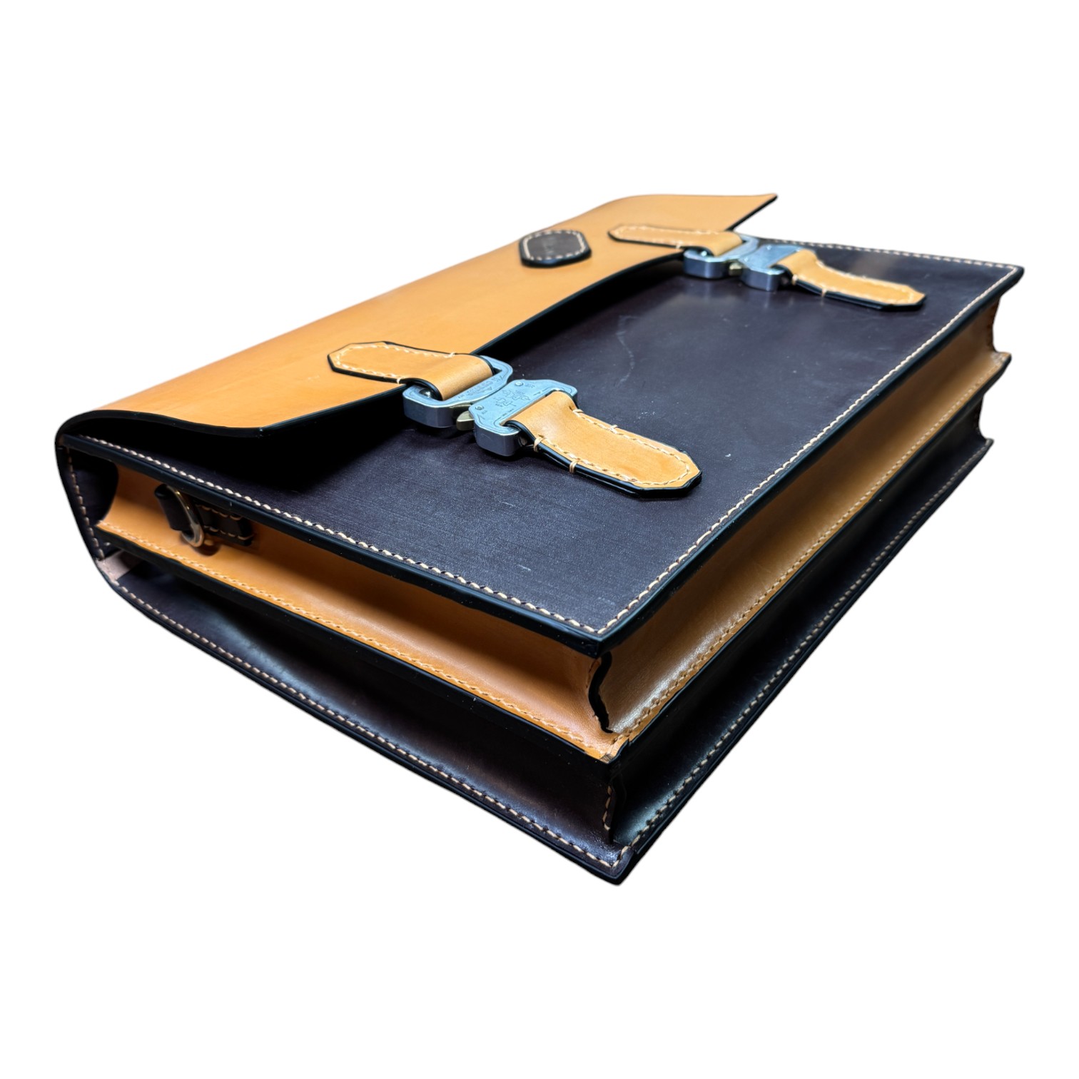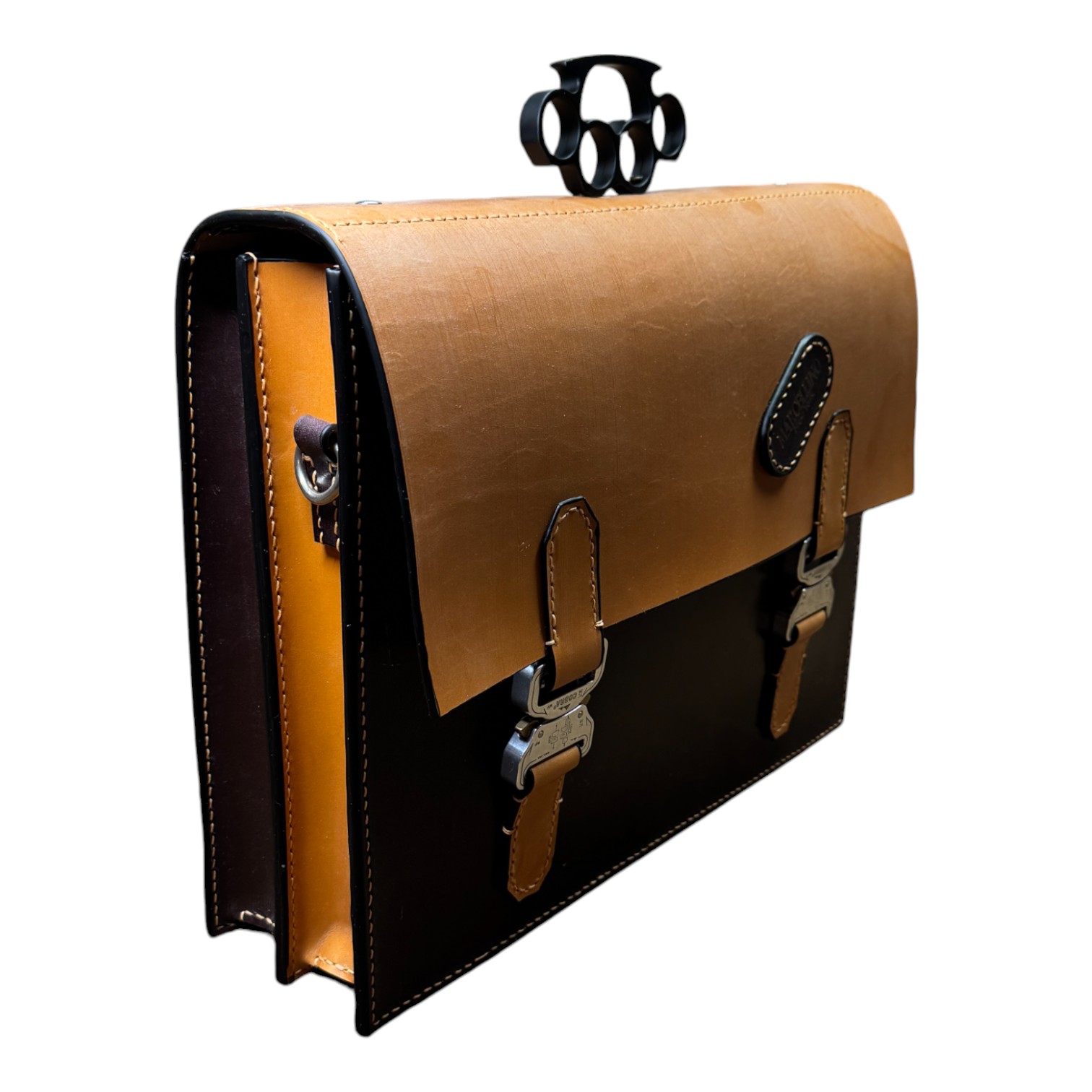 This briefcase is made from Burgundy and London Tan UK English bridle leather and a solid steel knuckle handle