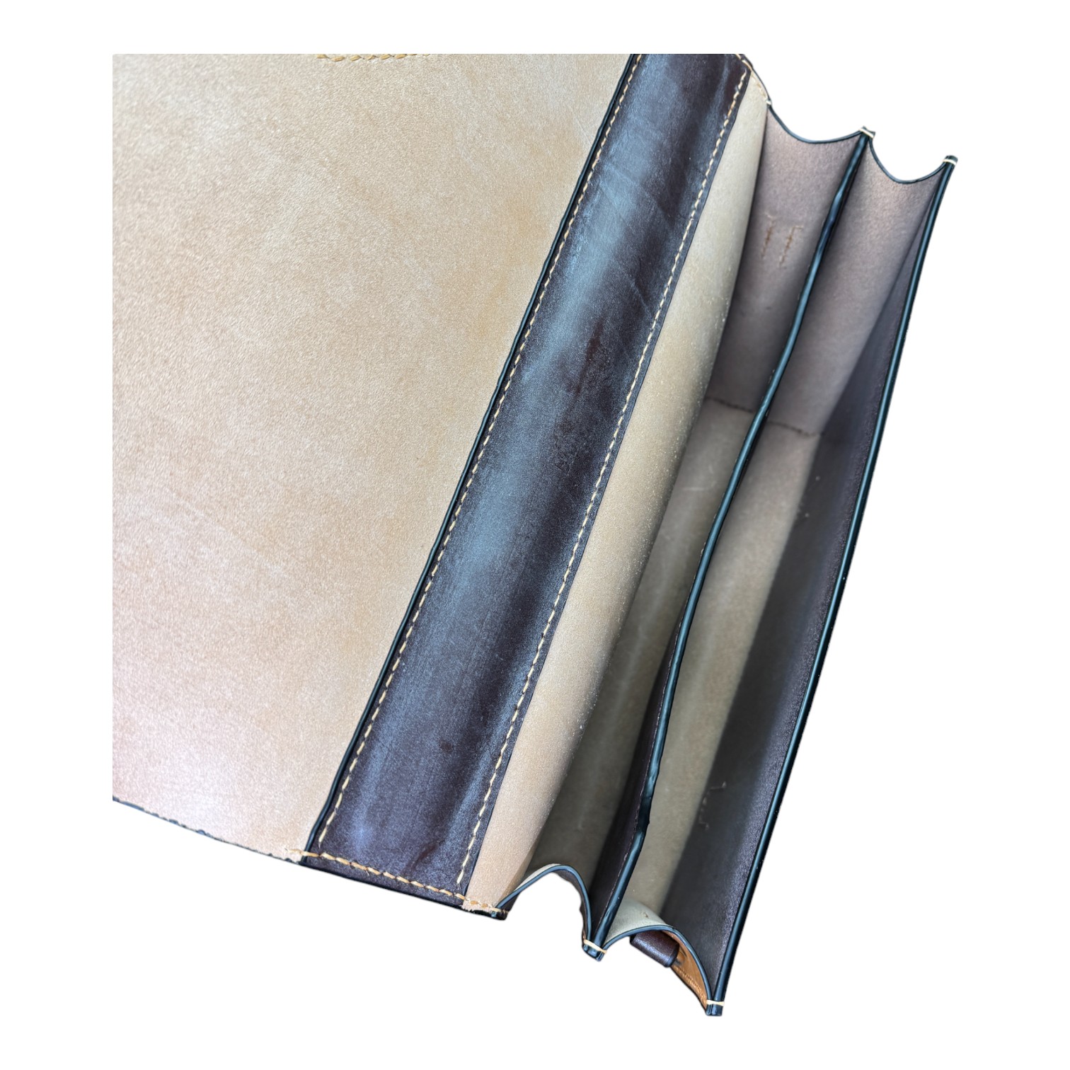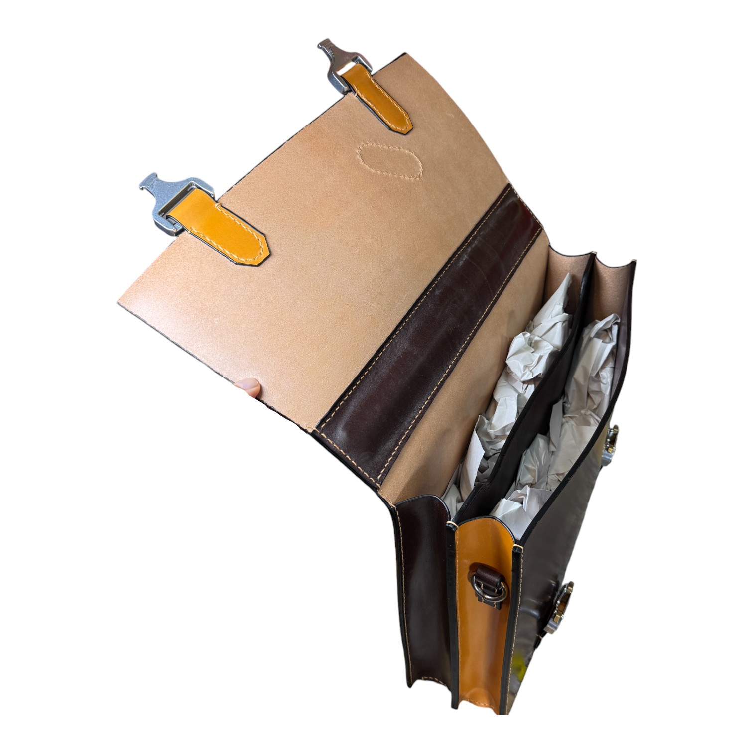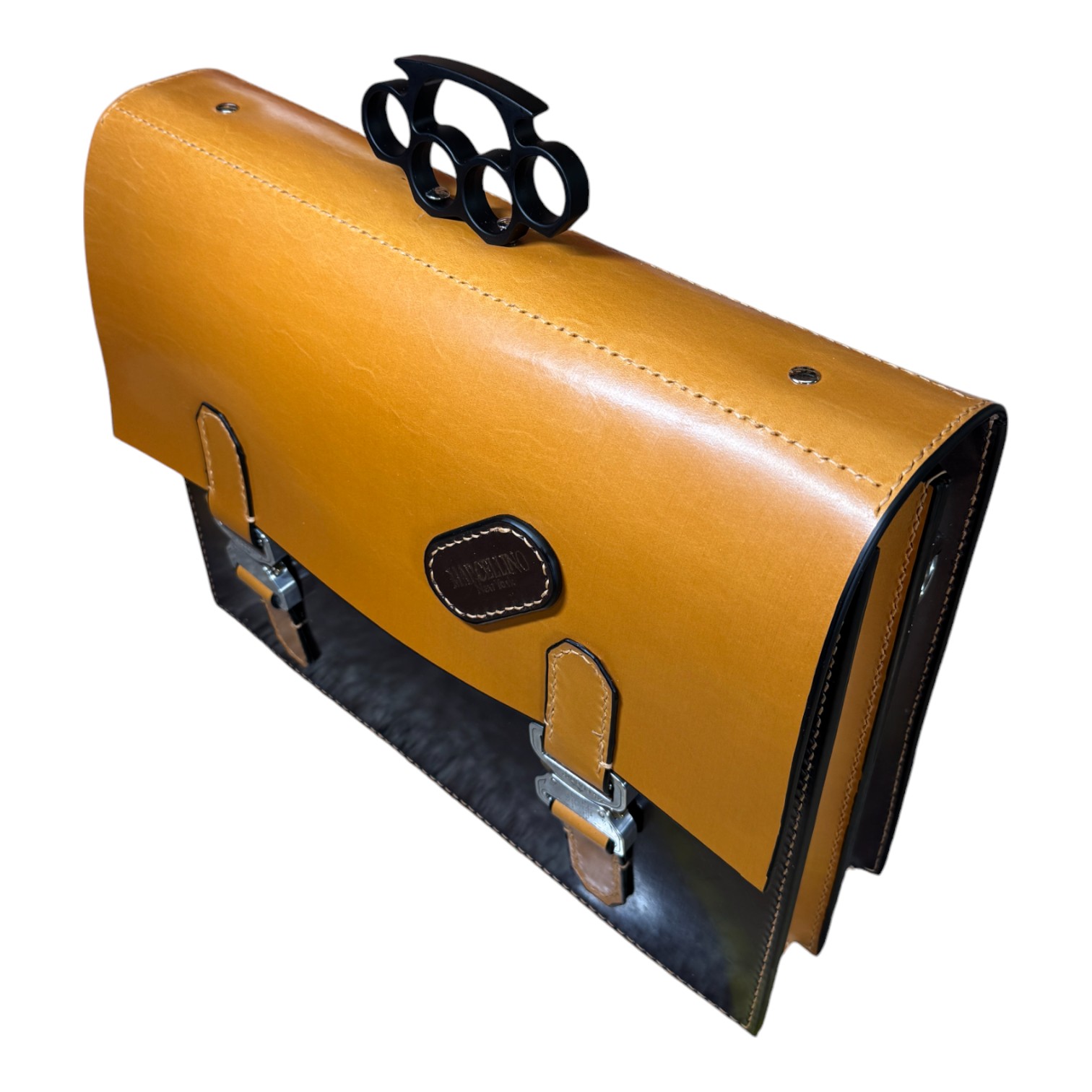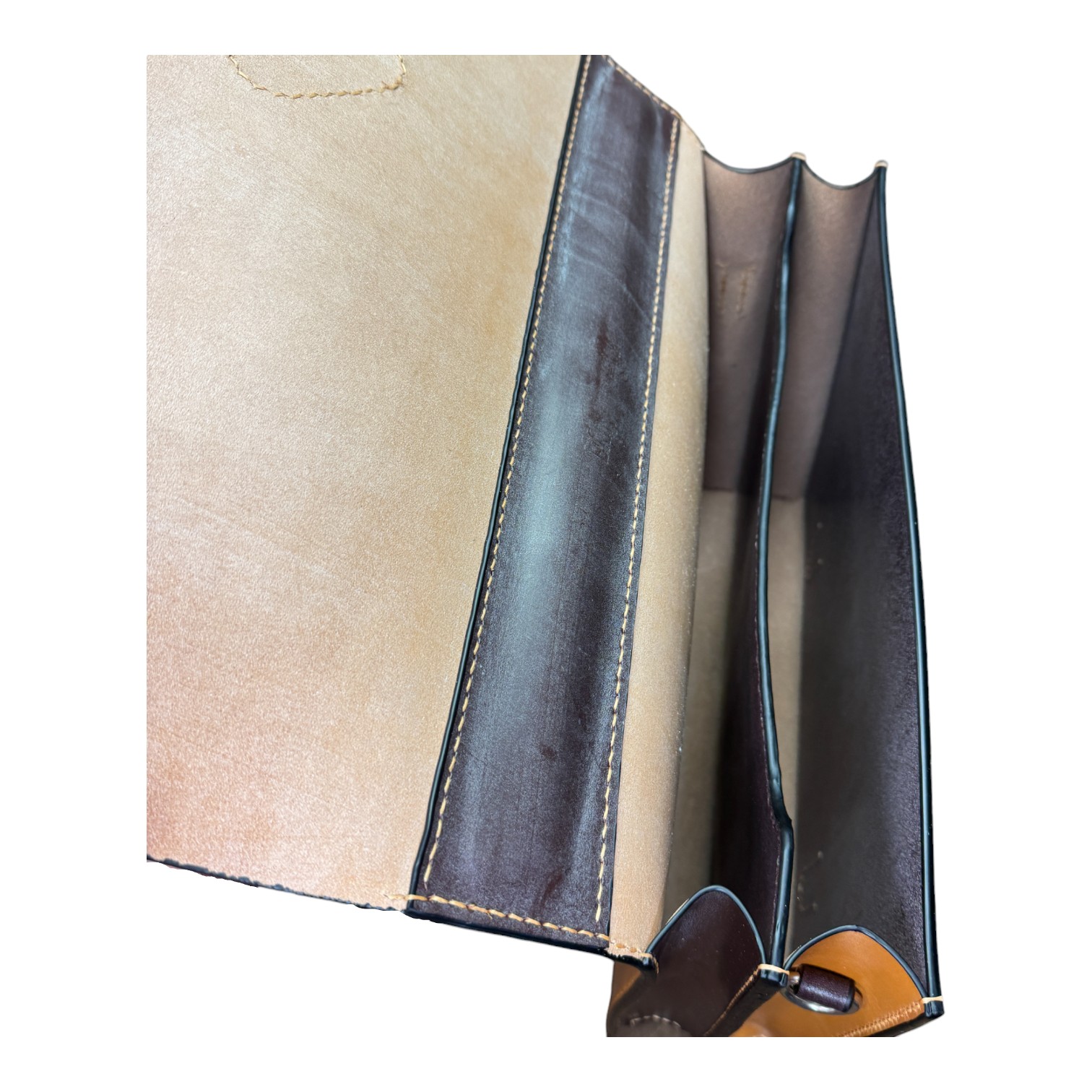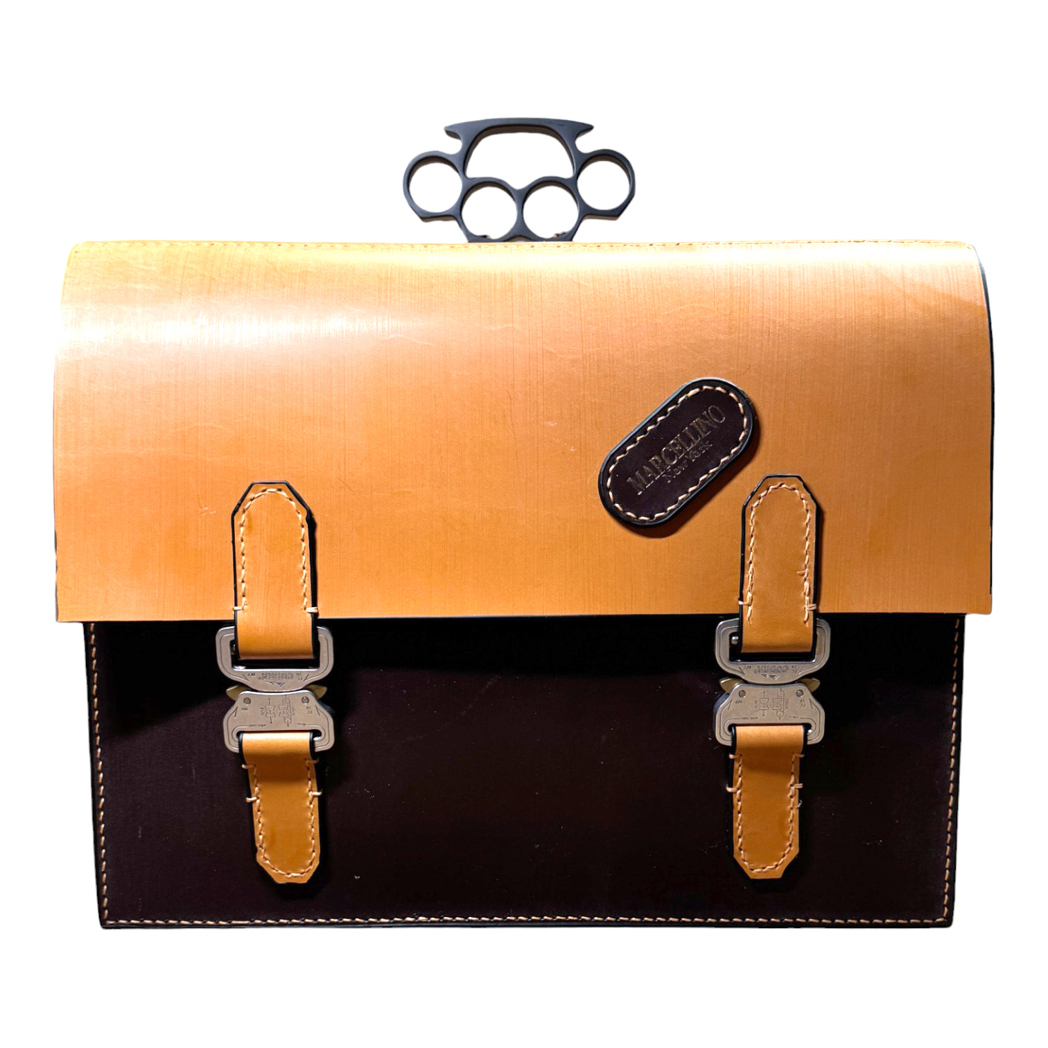 This briefcase is made from Burgundy and London Tan UK English bridle leather and a solid steel knuckle handle