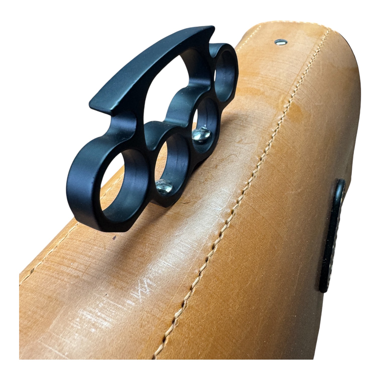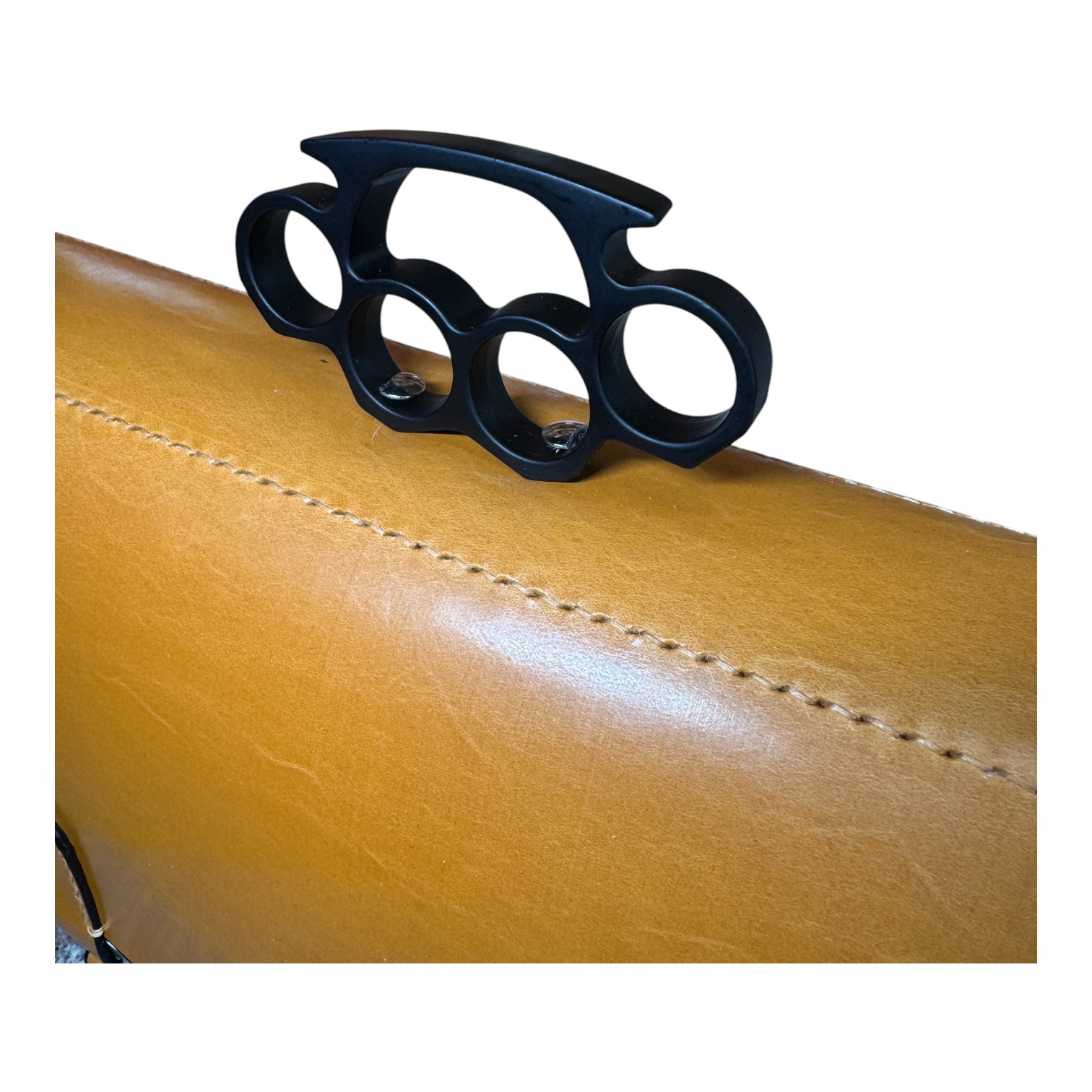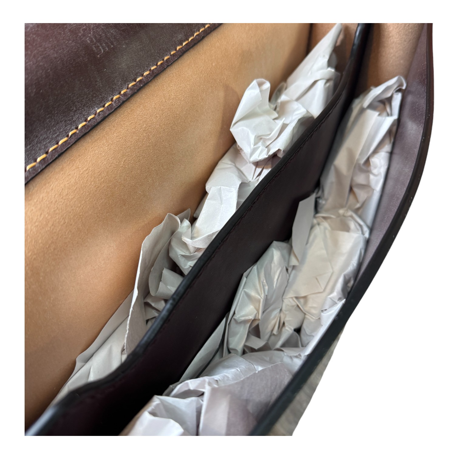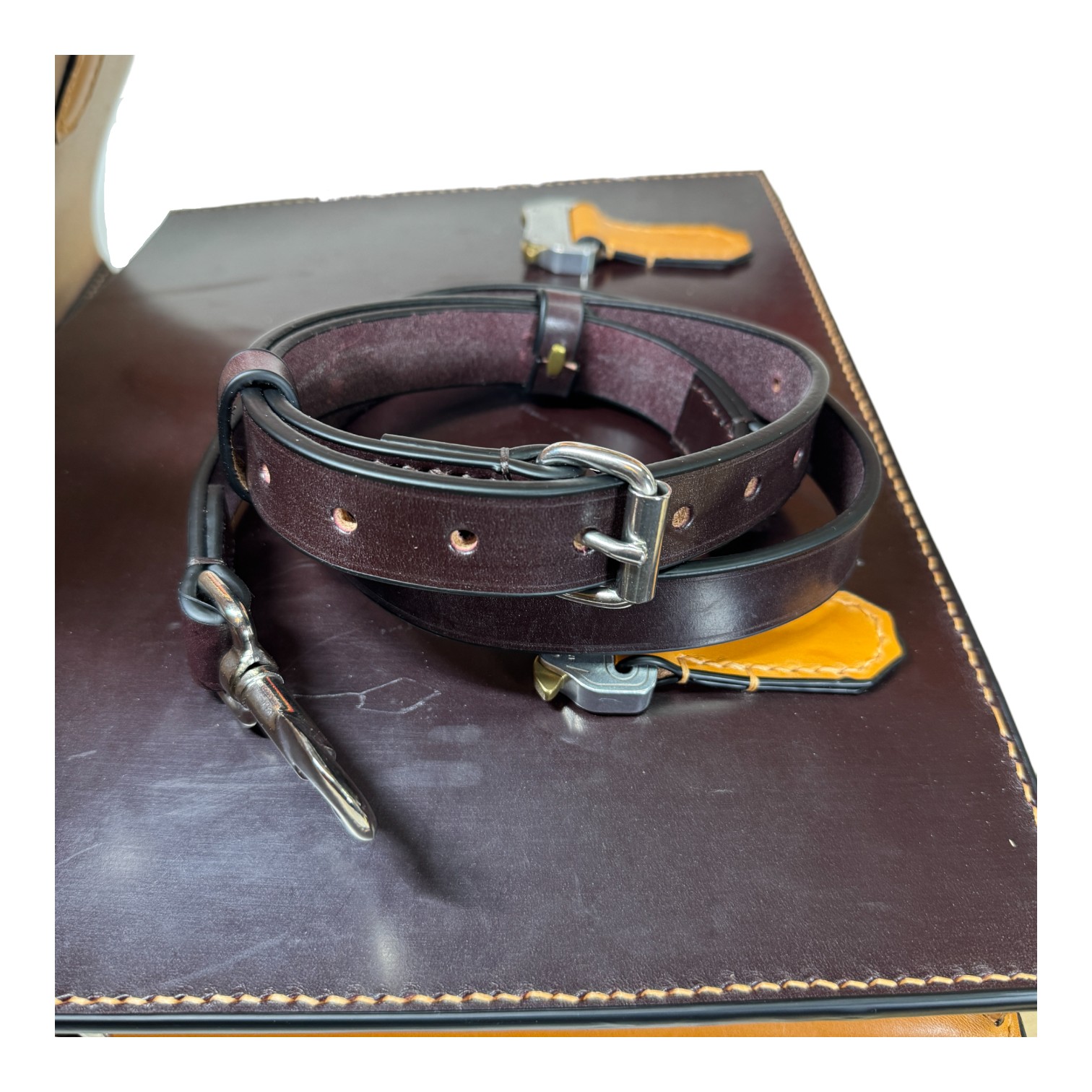 This briefcase is made from Burgundy and London Tan UK English bridle leather and a solid steel knuckle handle