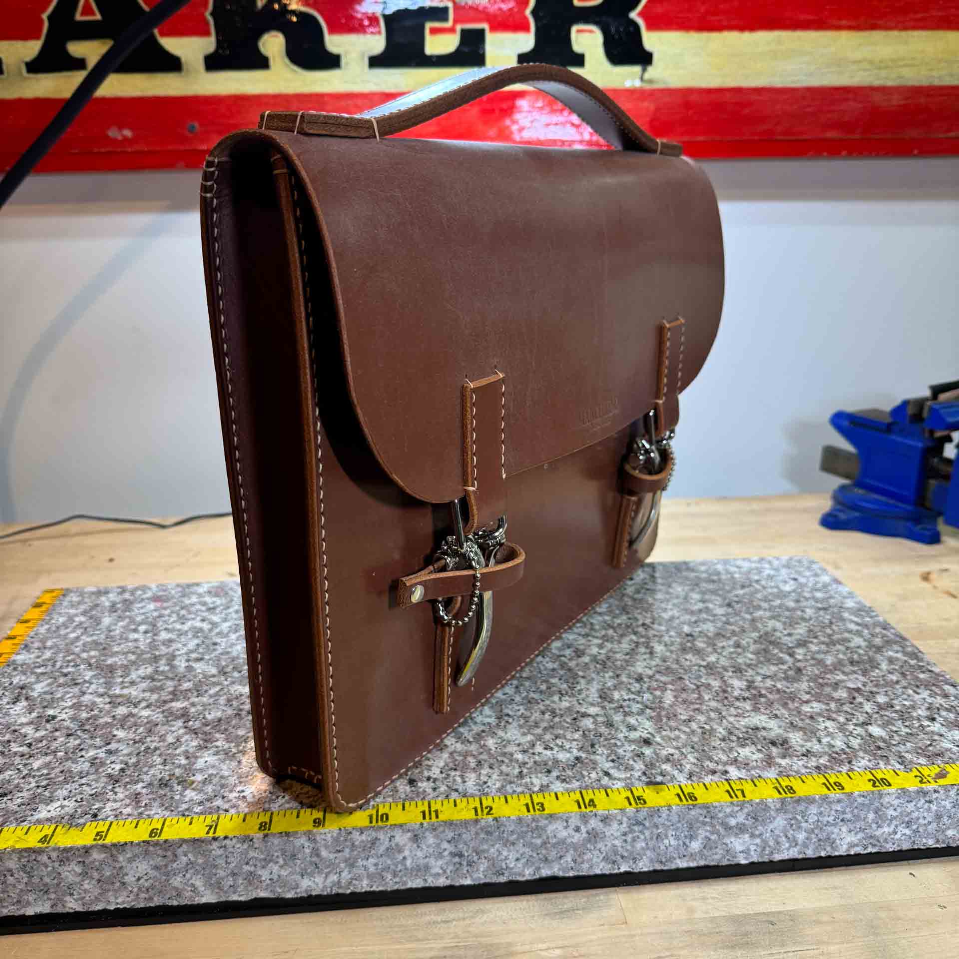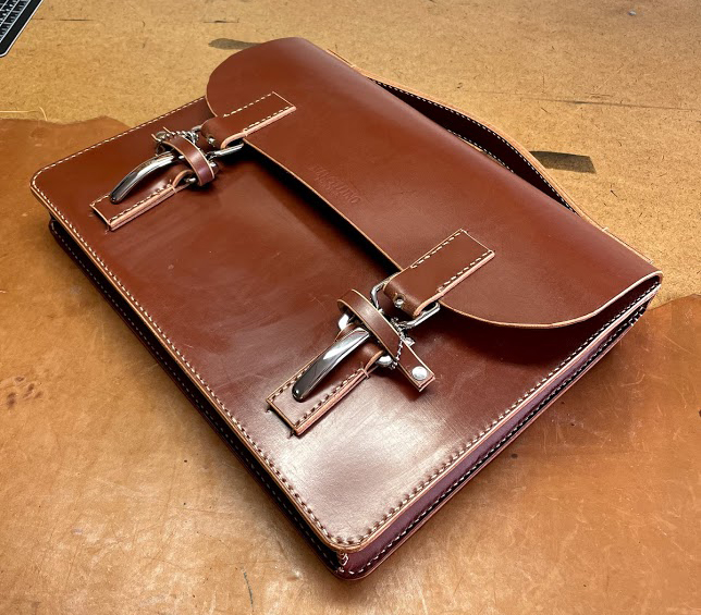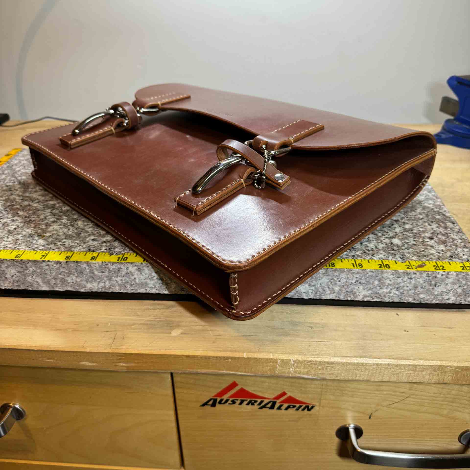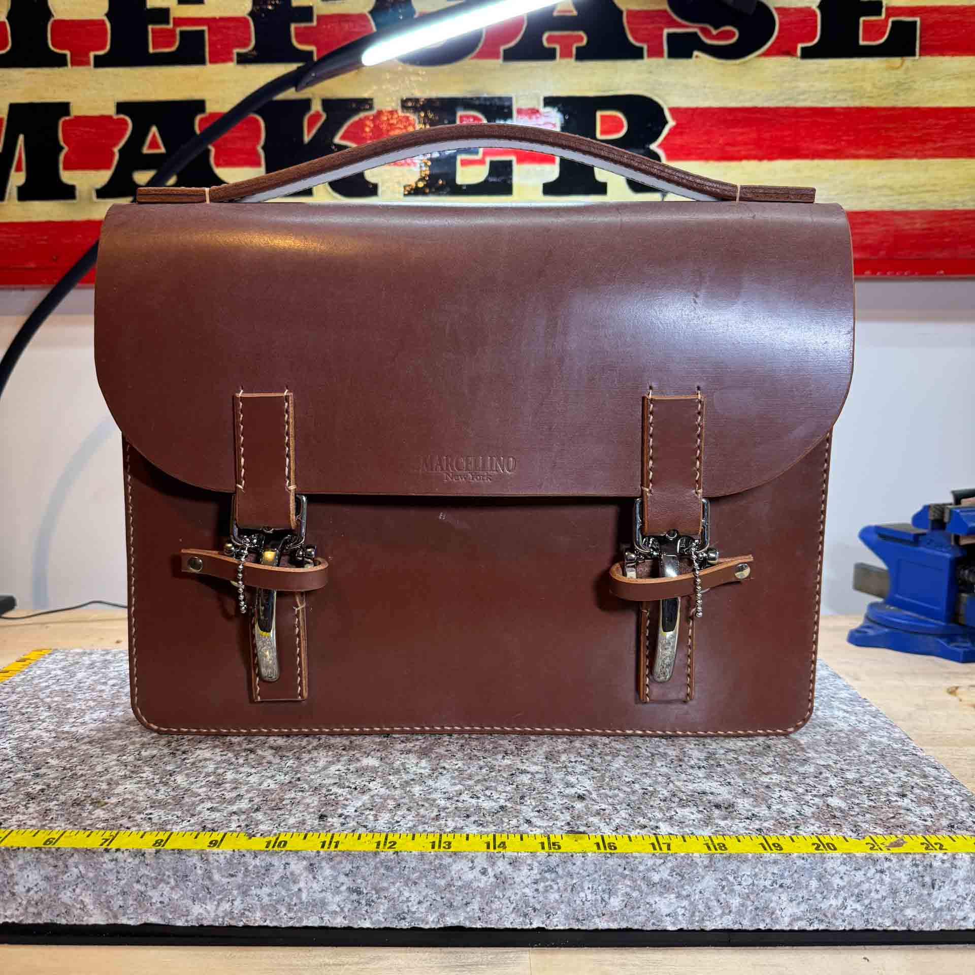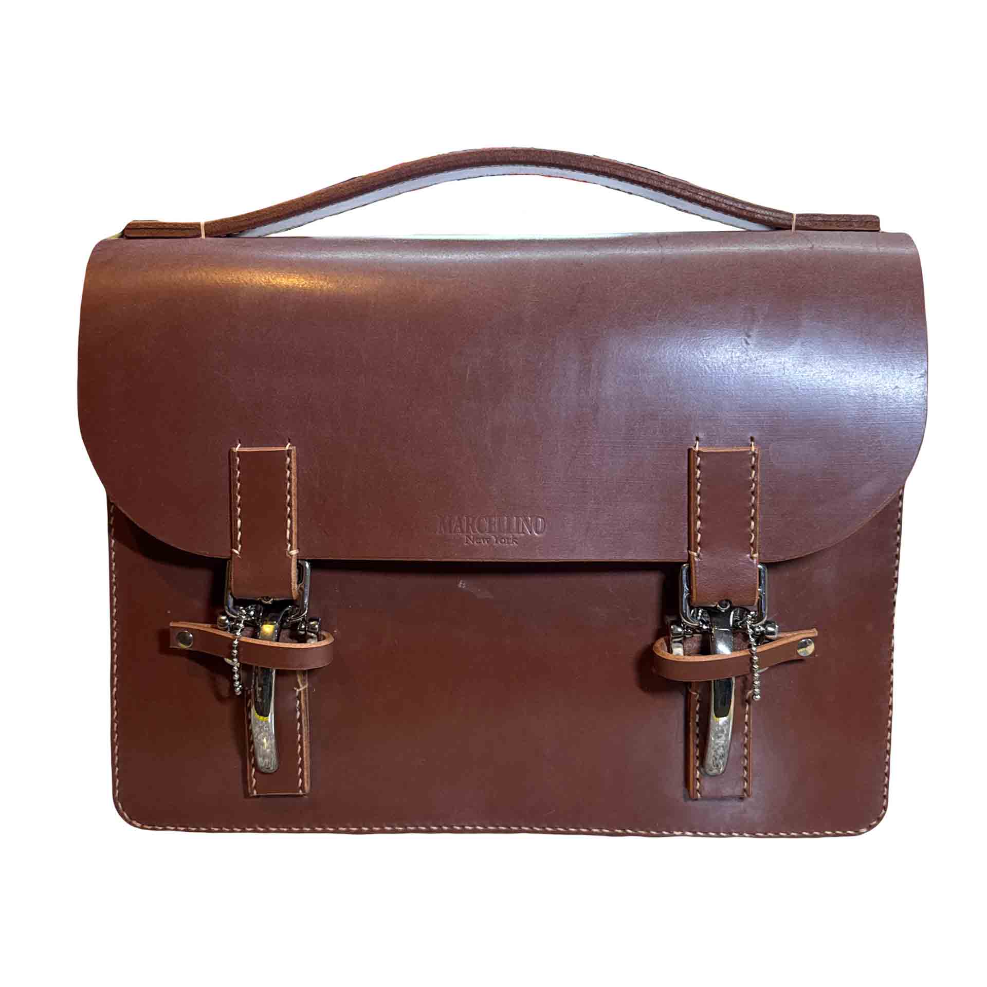 This is a single compartment thick English bridle leather briefcase / portfolio with double Marcellino Latches