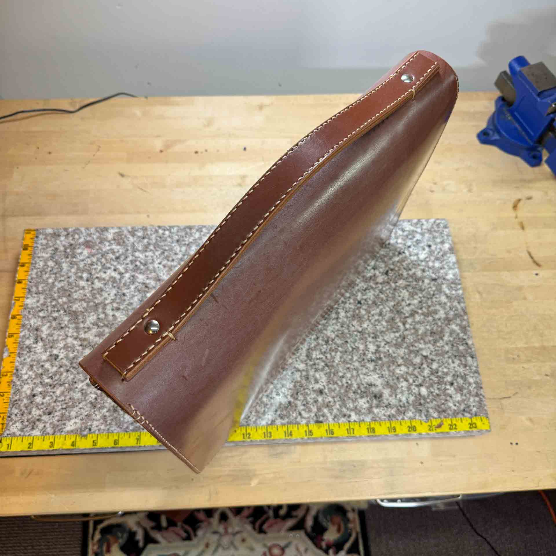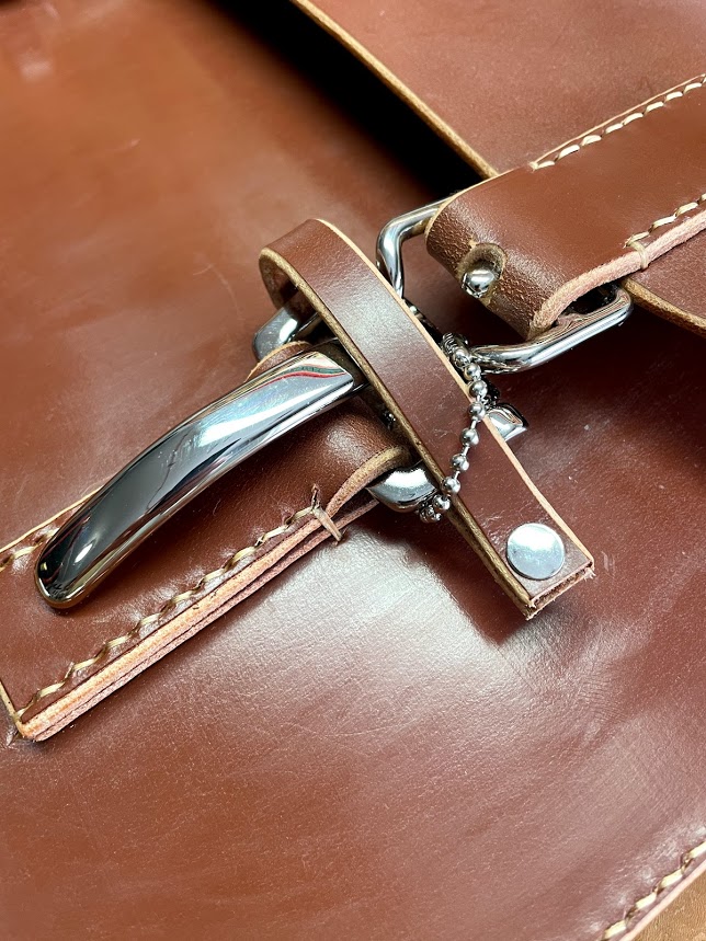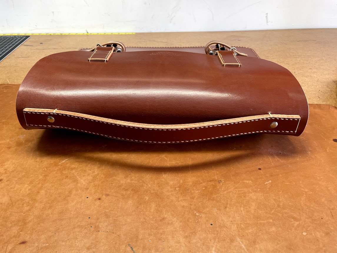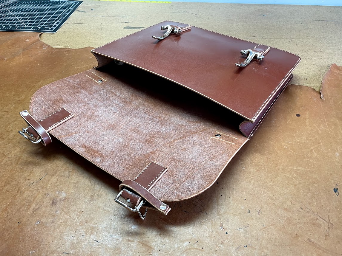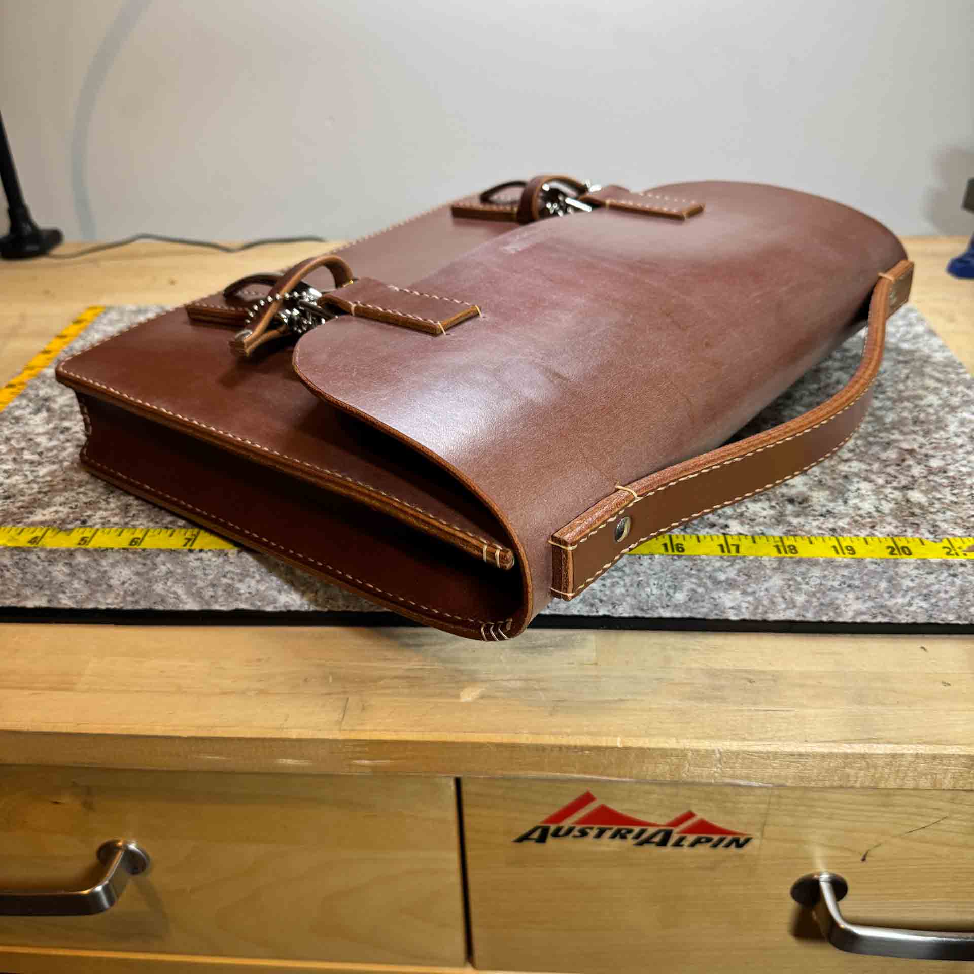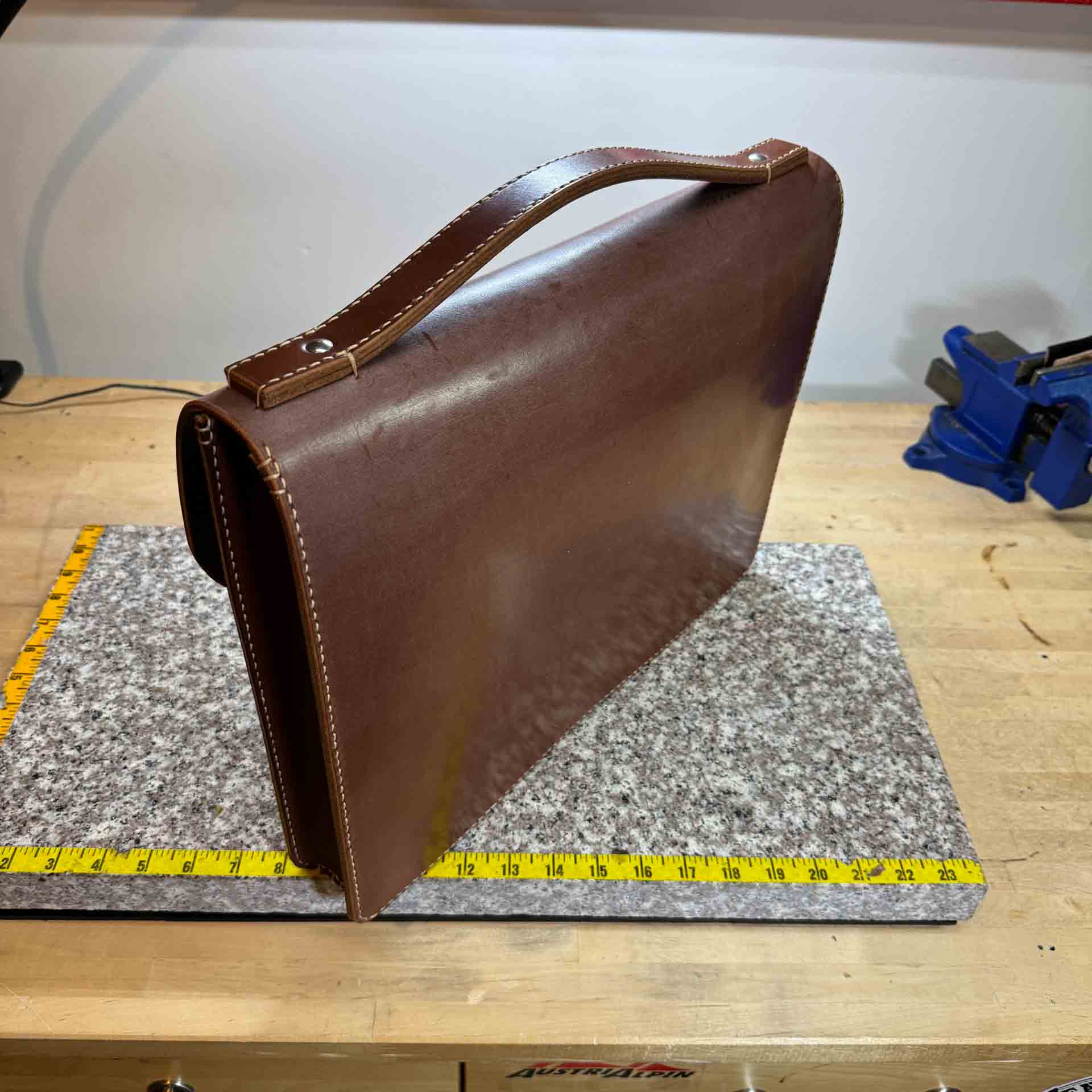 This is a single compartment thick English bridle leather briefcase / portfolio with double Marcellino Latches