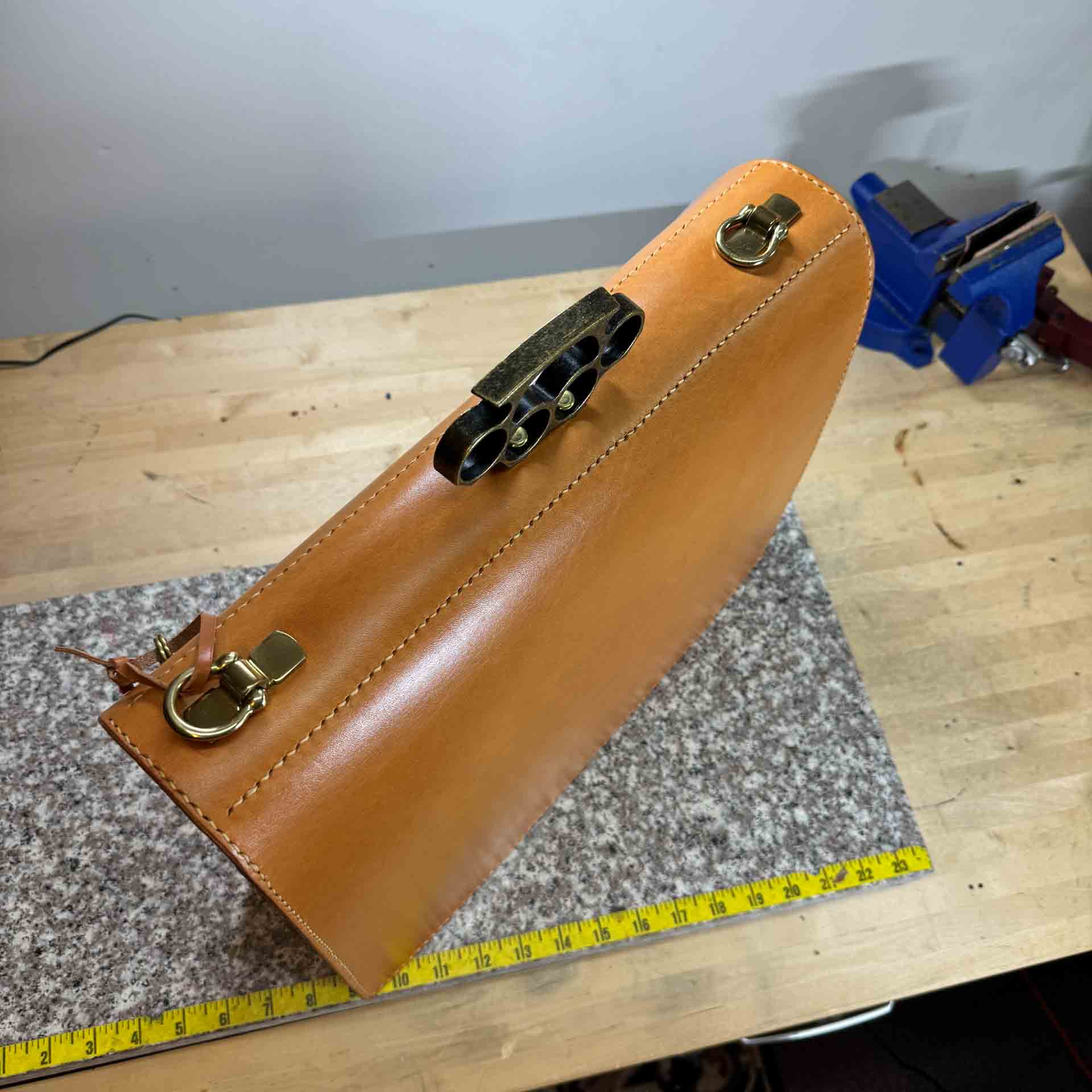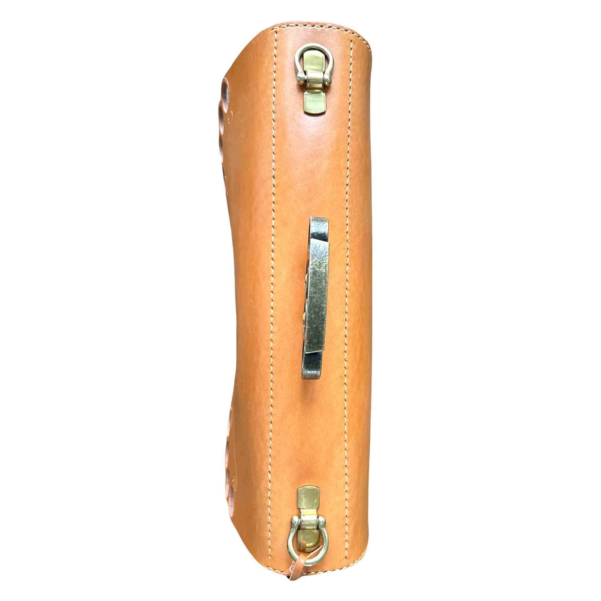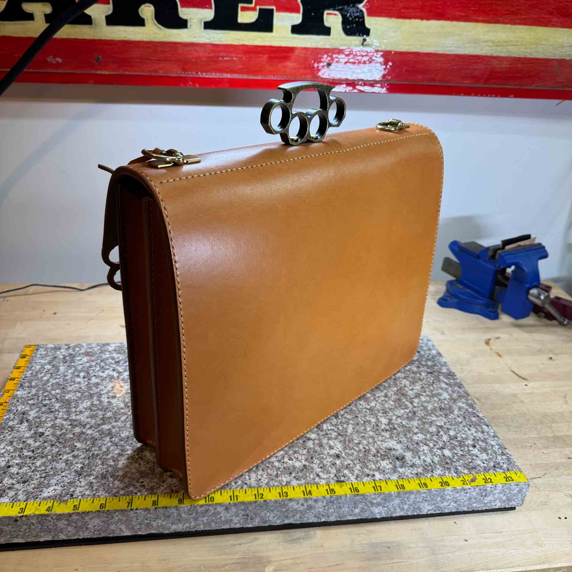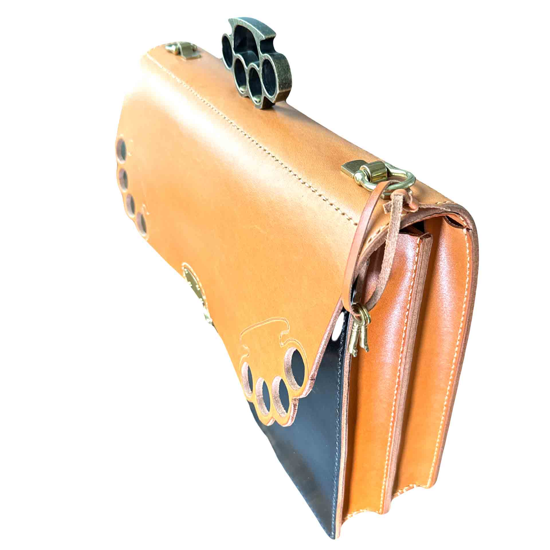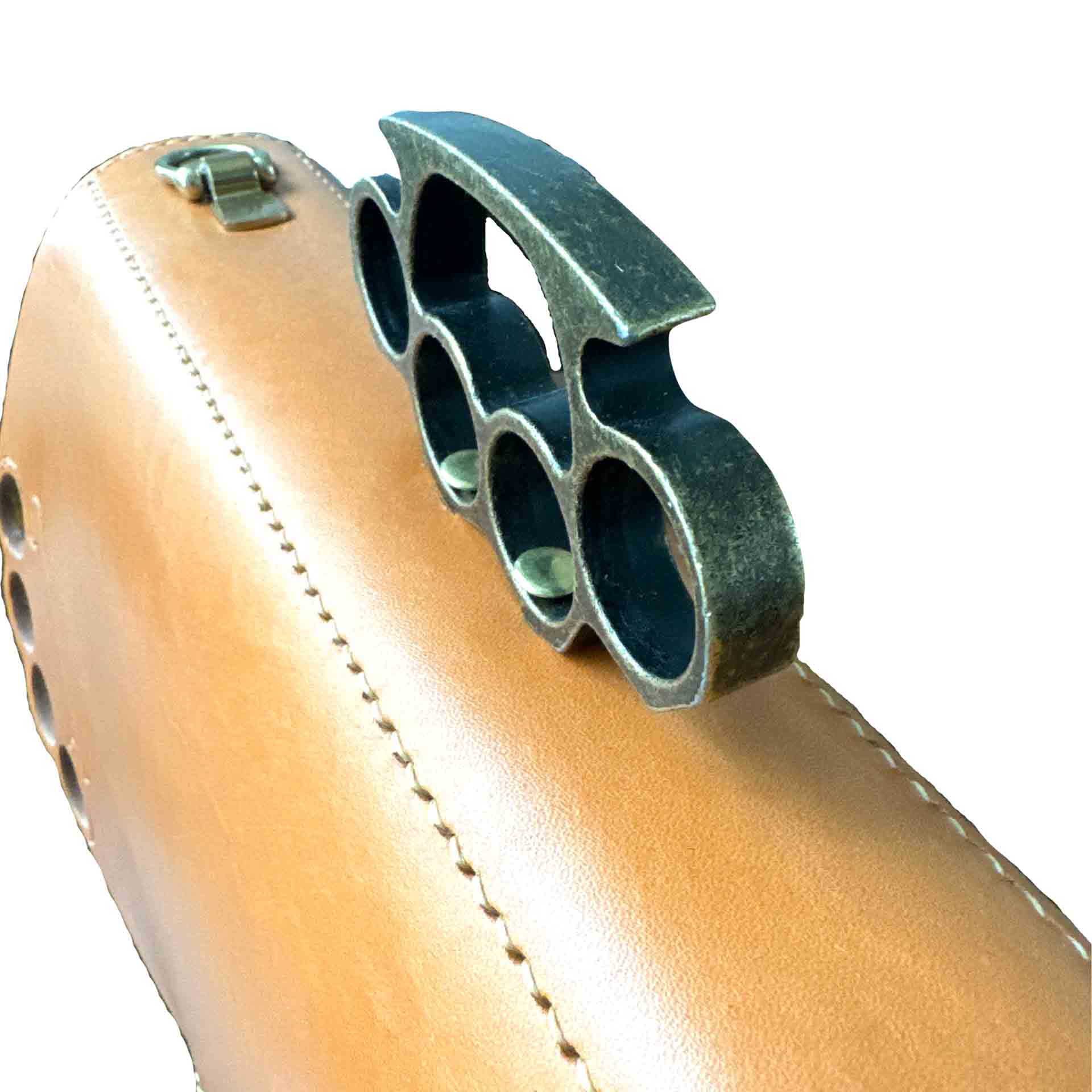 The Brass Knuckle Handle is the standout feature of this traditional English bridle leather briefcase. It embodies both resilience and a distinctive flair, while offering a sturdy and ergonomic grip. Designed to fit the contours of your fingers, the handle’s solid steel construction ensures it is indestructible under normal conditions.