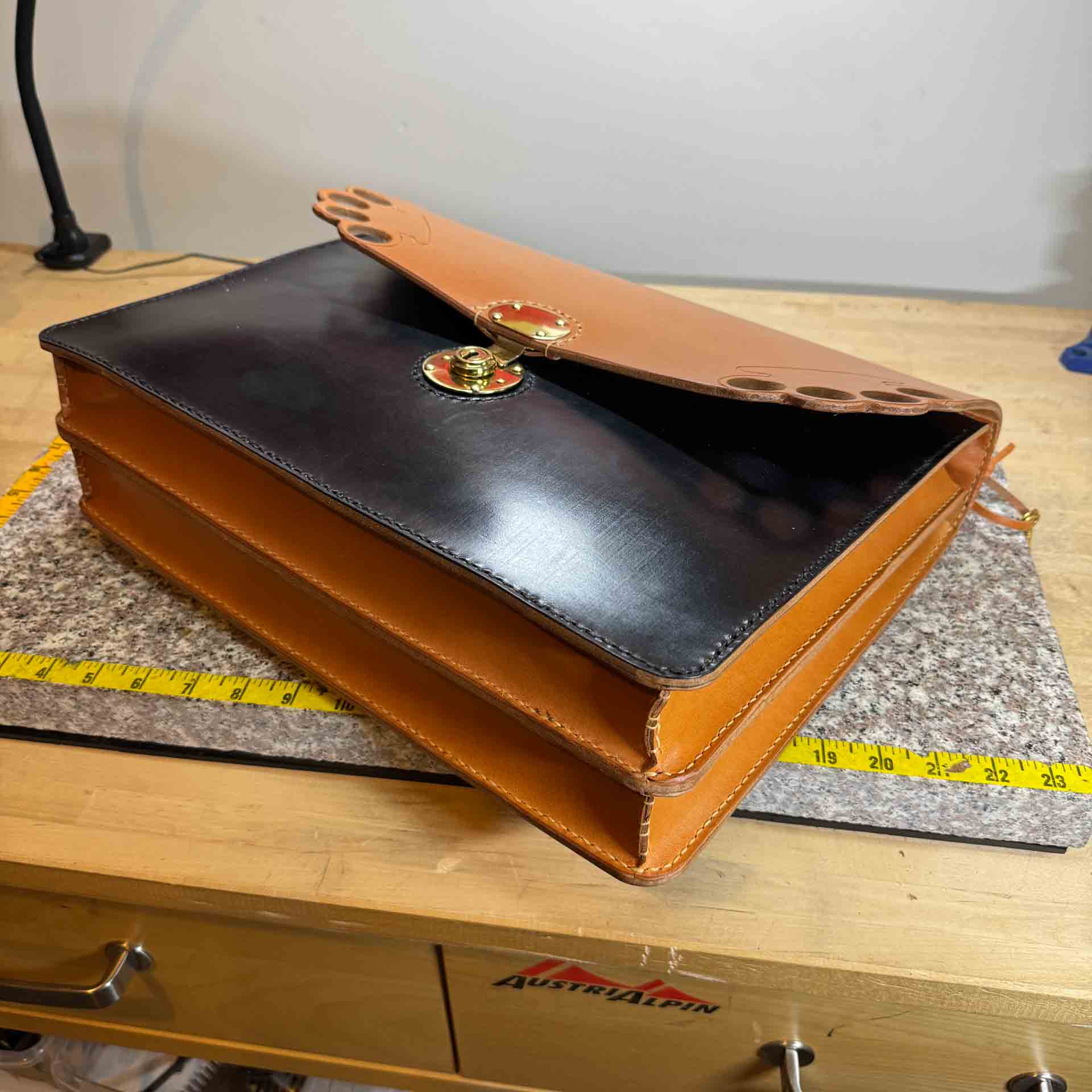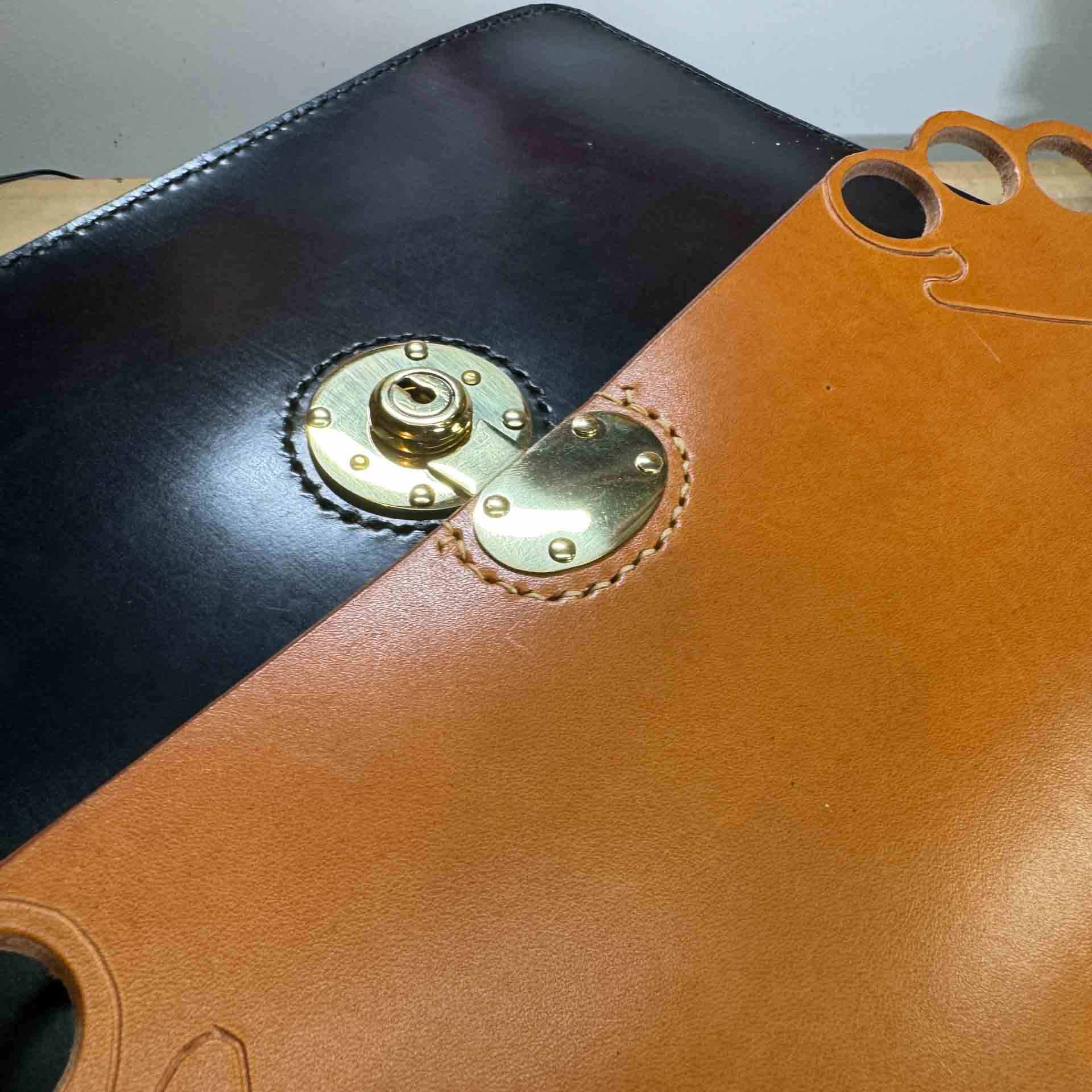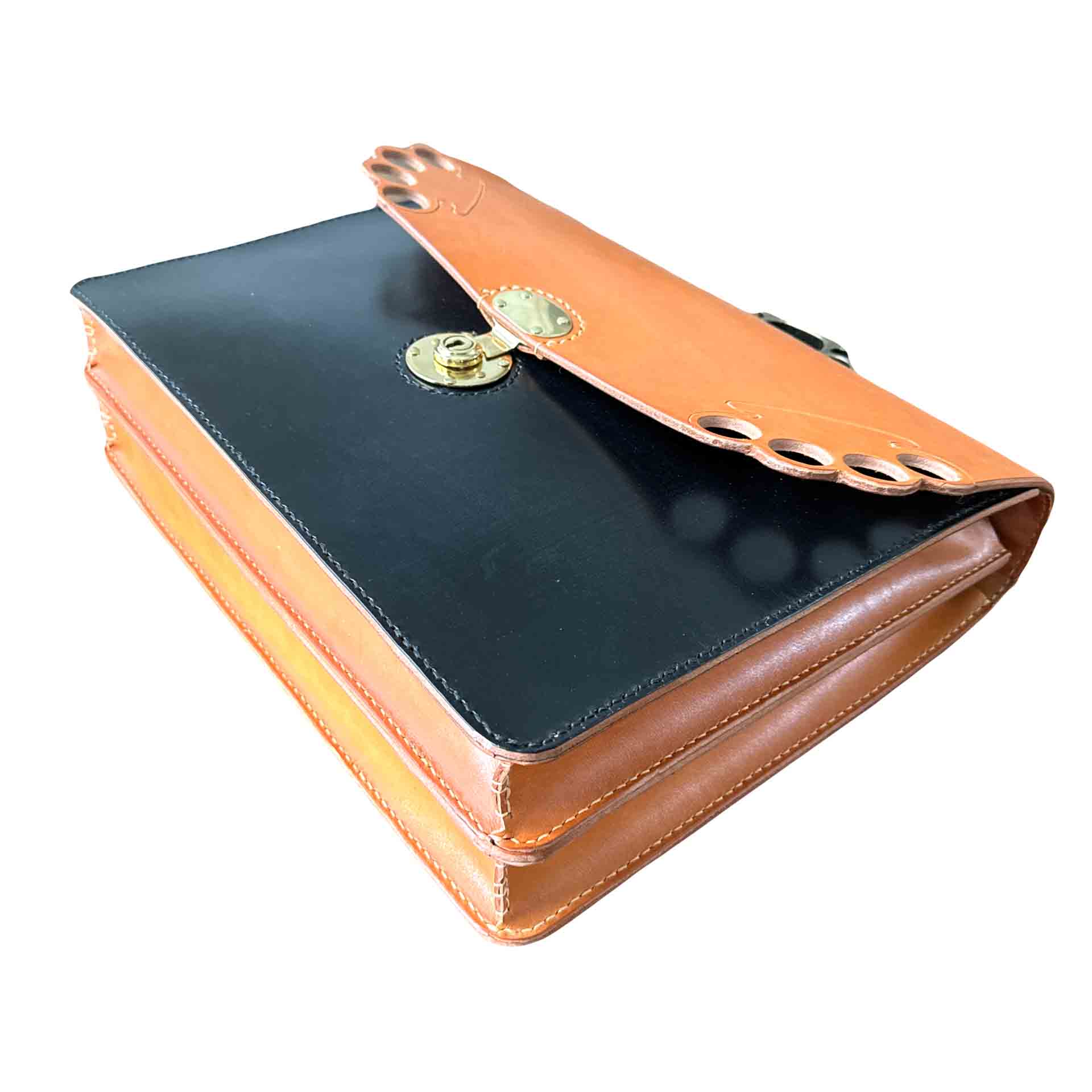2 section black and London tan bridle leather briefcase with a brass classic English tube key lock and knuckle handle. Comes with a shoulder strap.