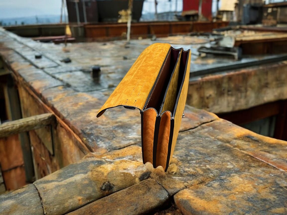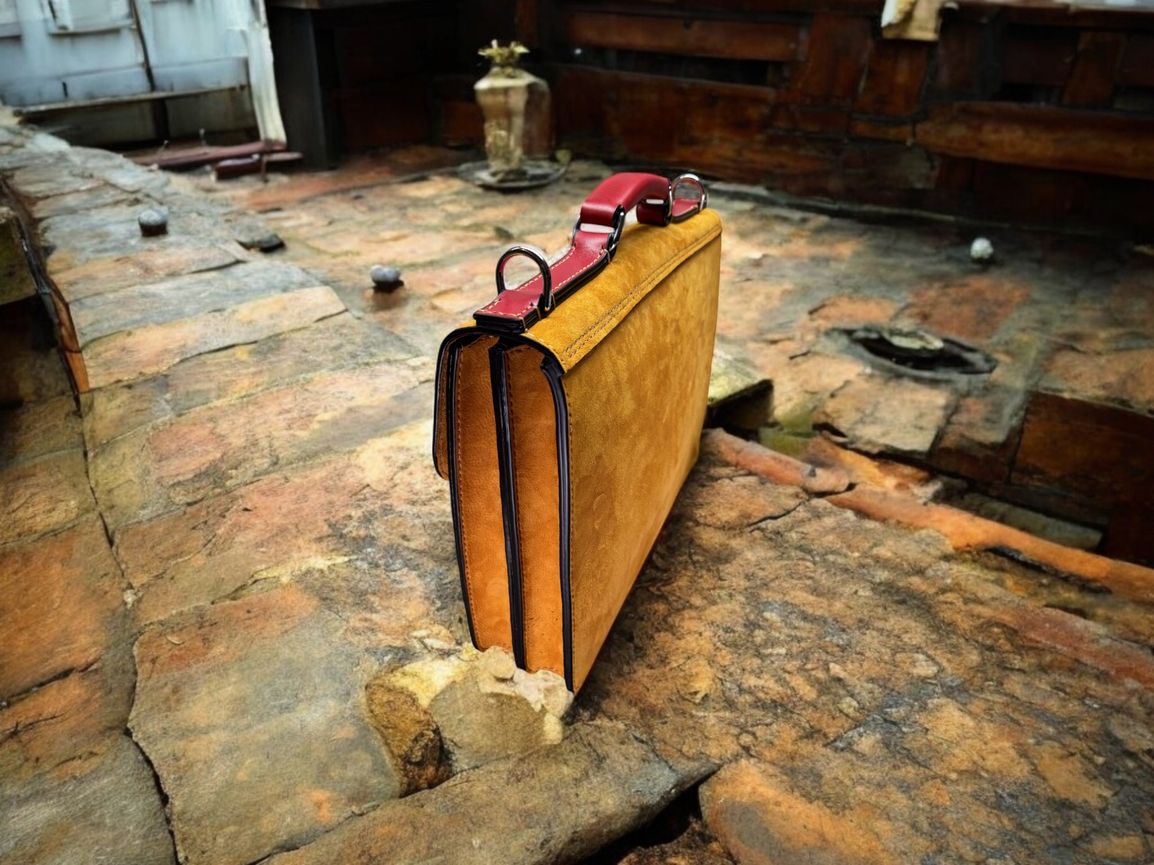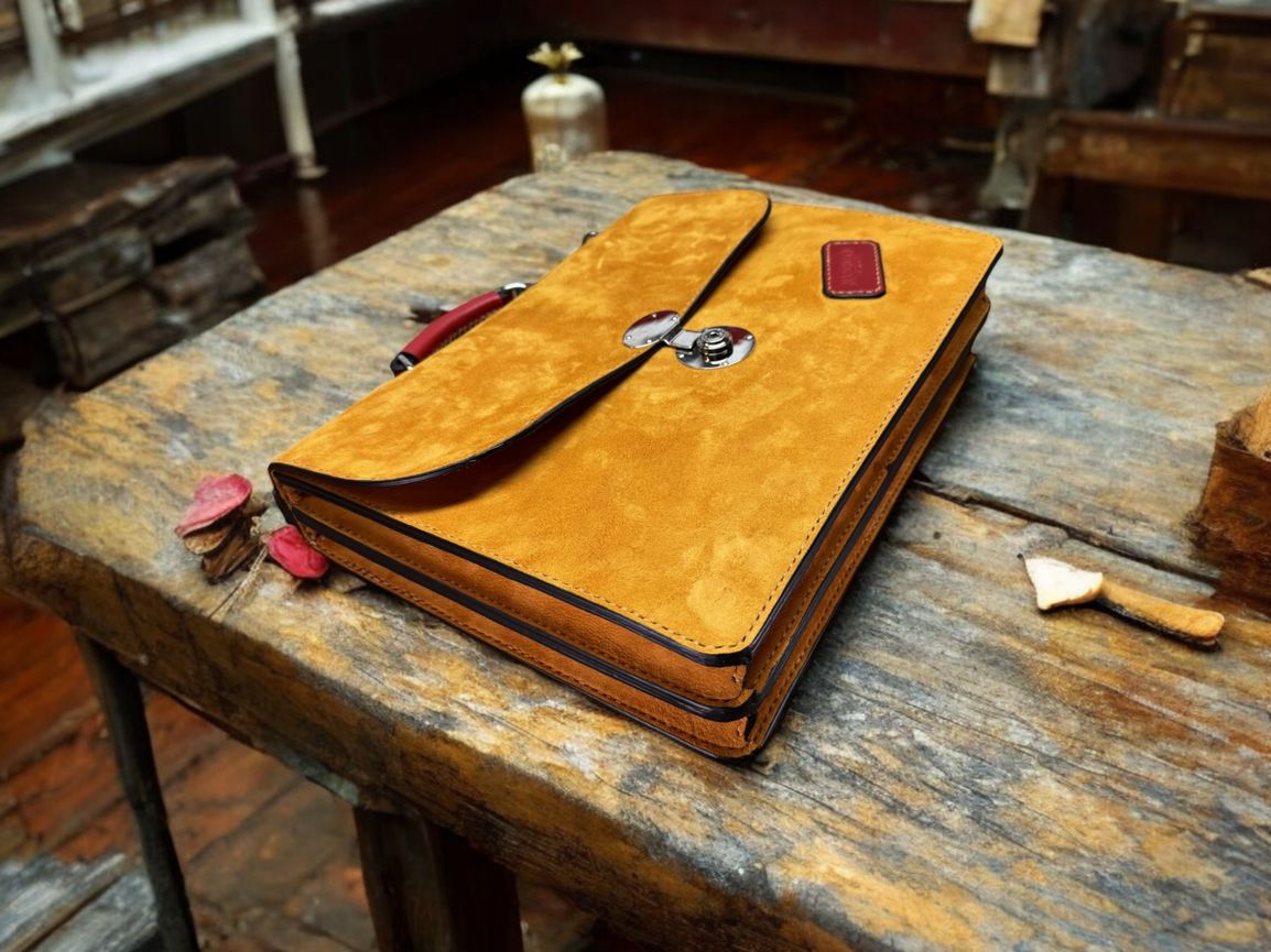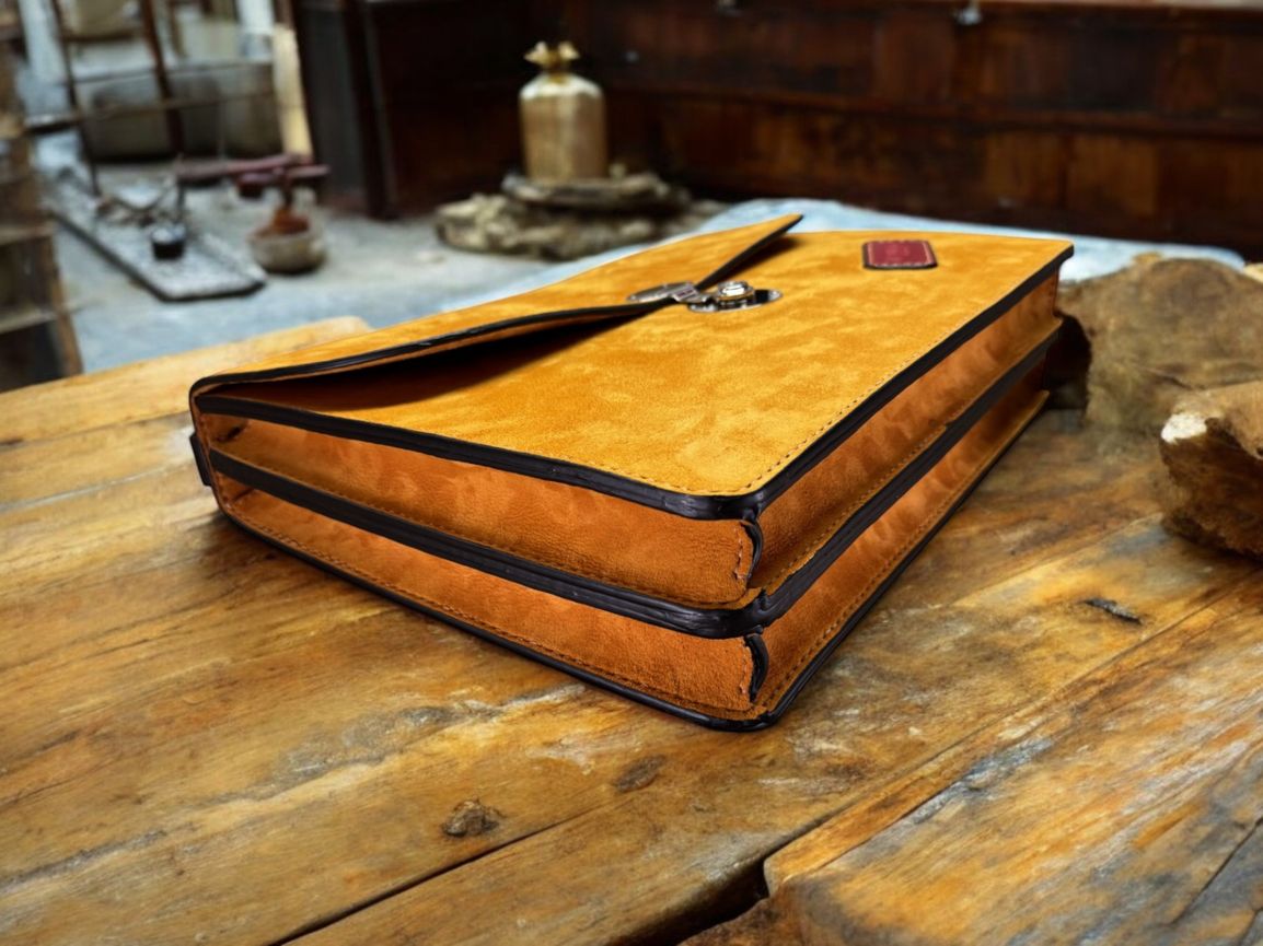 • This briefcase is made from Sheep skin suede leather outer with a thick stiff bridle leather structure and lining.