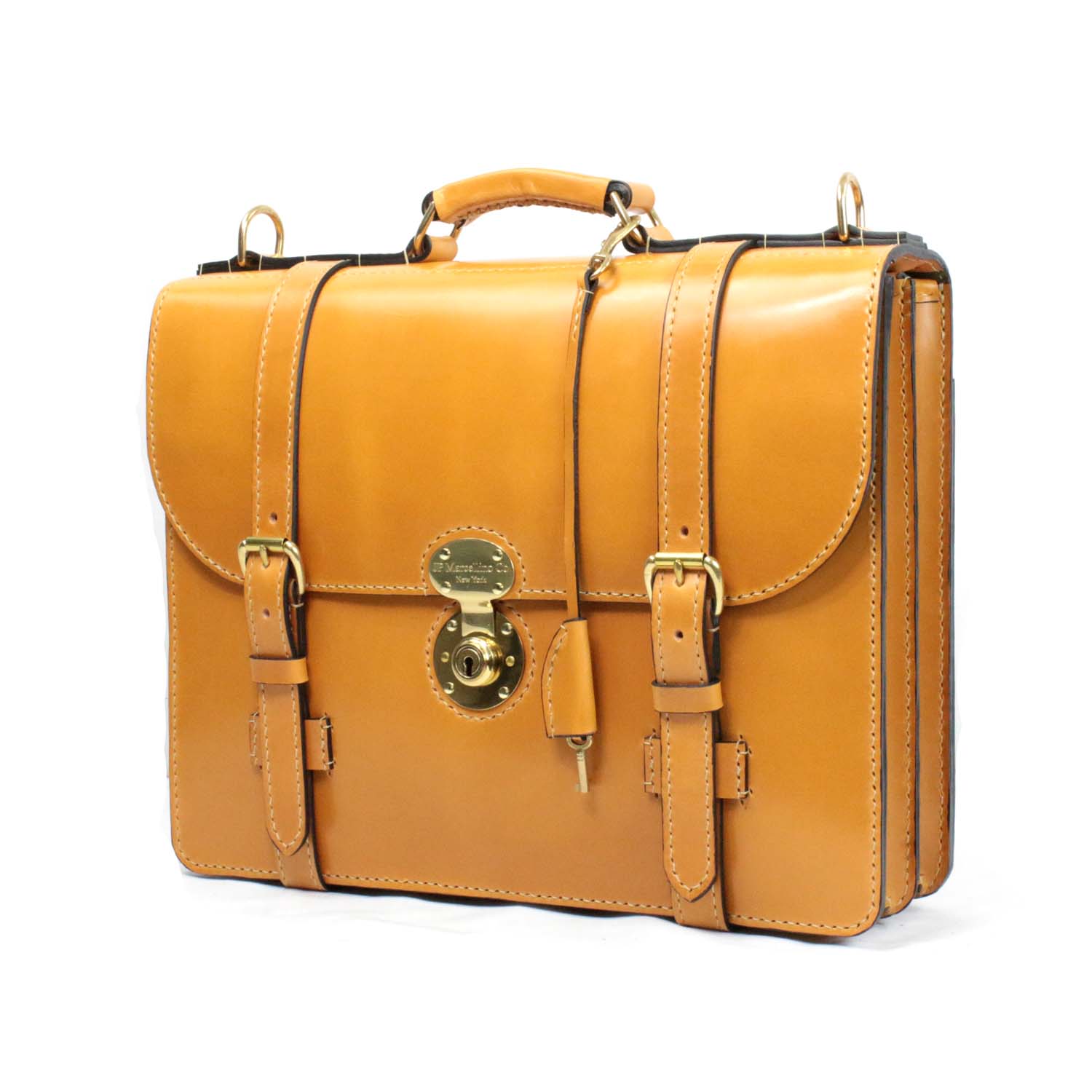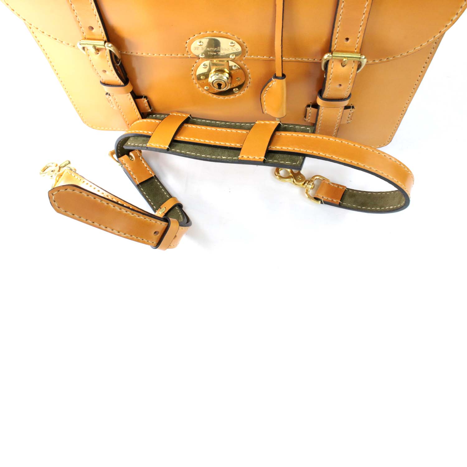 The Alfred Wallace is a classic English briefcase style, made in the same way these cases were built over 100 years ago.  All hand saddle stitched using authentic UK English bridle leather, removable shoulder straps and a high-end solid brass handmade lock that I install with strong real rivets.  The brass key lock just gives it the authenticity of a classic English style. Comes with custom inside pockets, an outside pocket and either a natural lining or a full Italian calf suede lining.