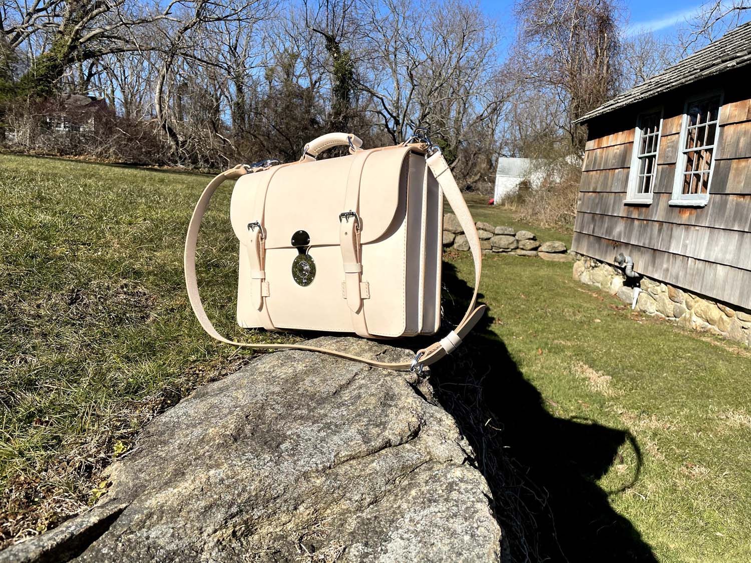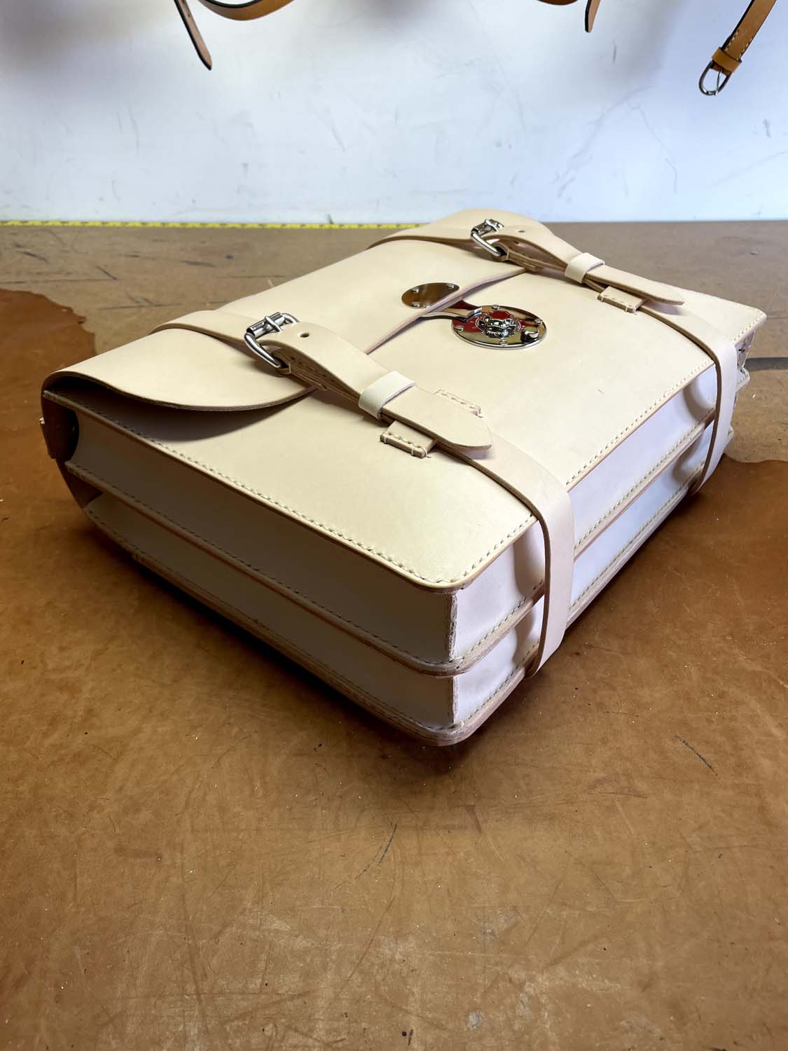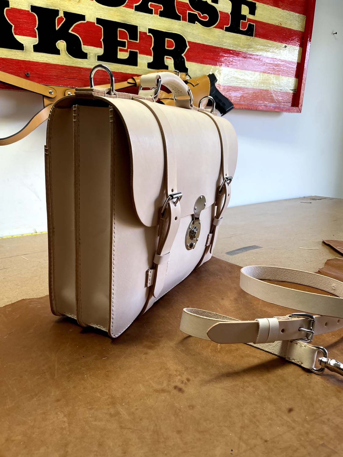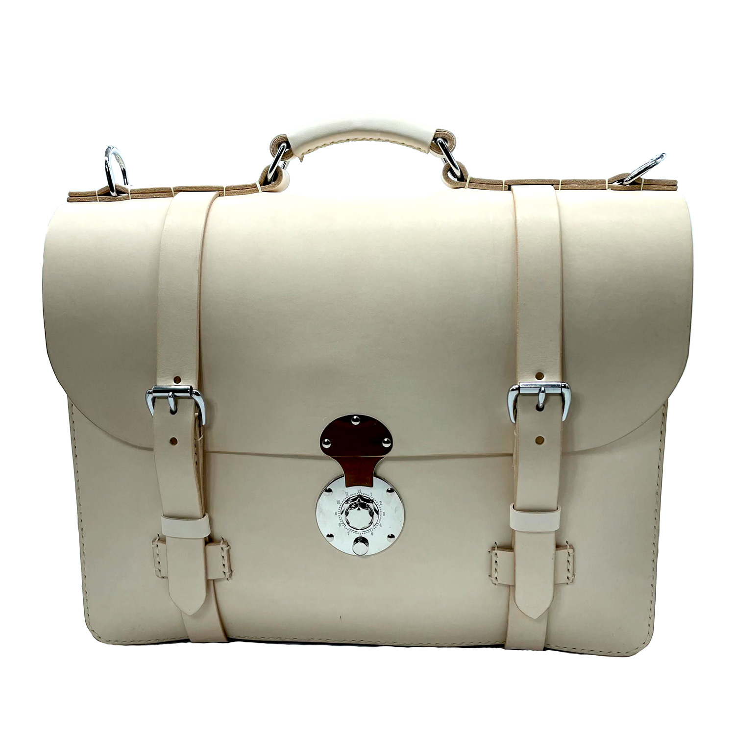 This is all-natural vegetable tanned leather made in my classic Wallace briefcase style that has front removable straps and a center lock, inside pockets, a back news paper pocket and a natural lining.