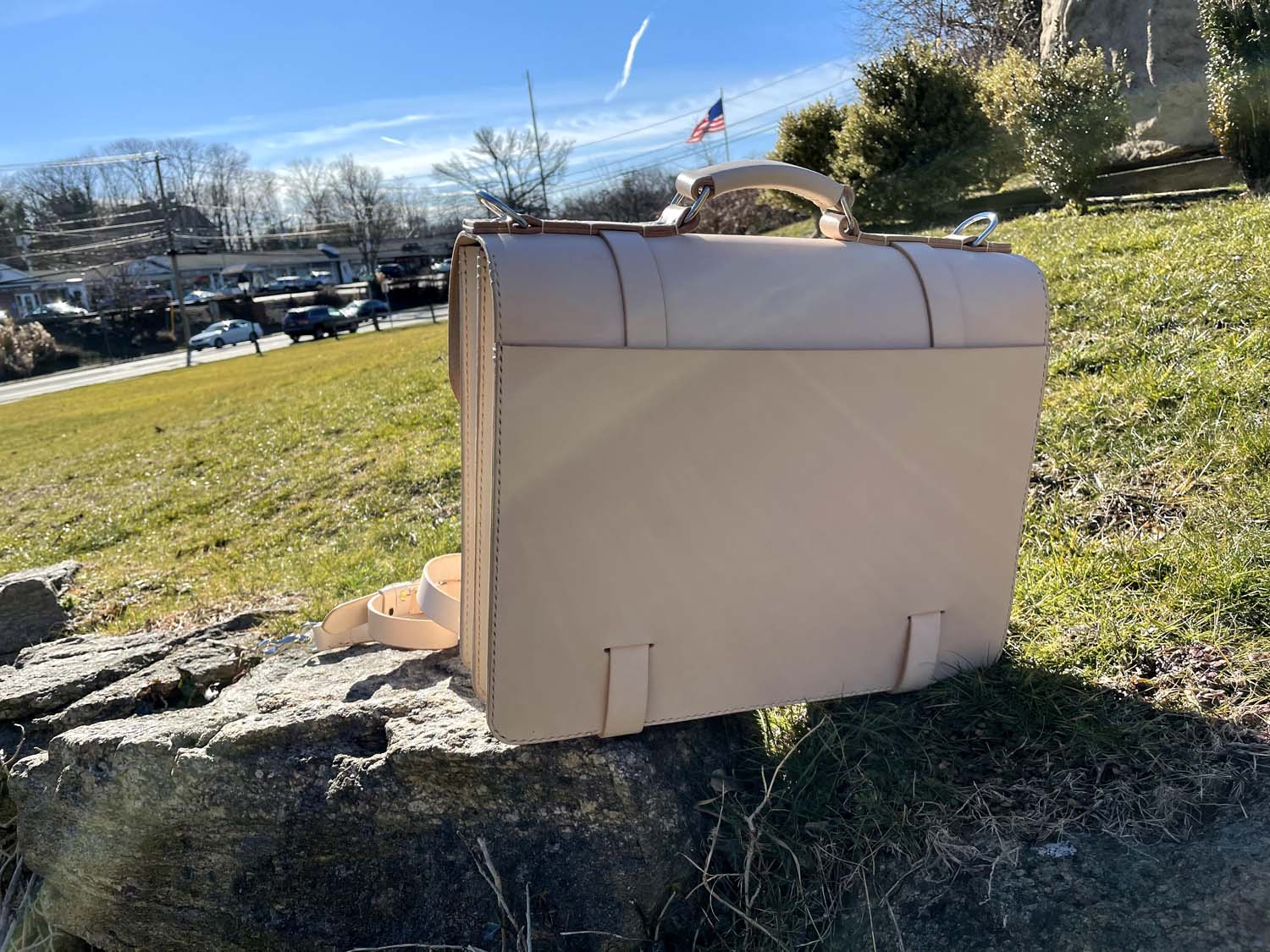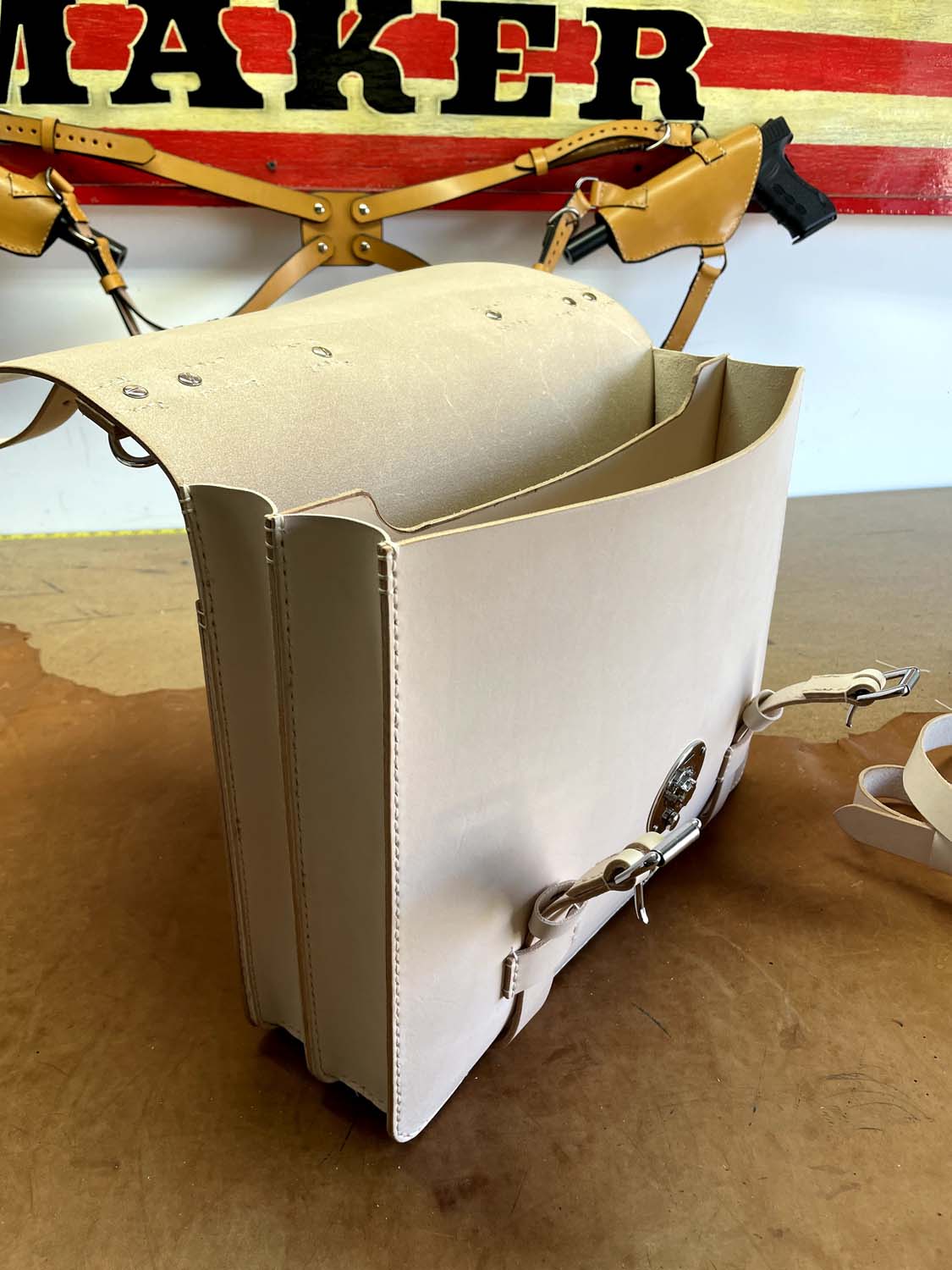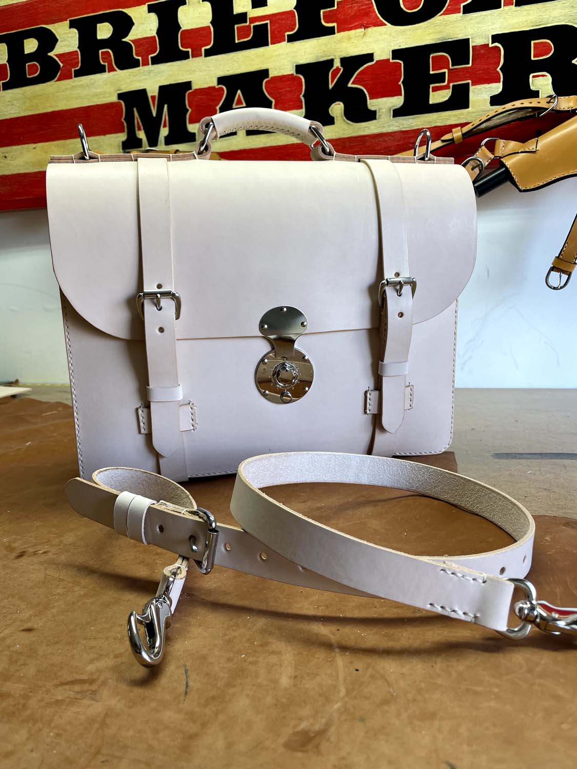 This is all-natural vegetable tanned leather made in my classic Wallace briefcase style that has front removable straps and a center lock, inside pockets, a back news paper pocket and a natural lining.