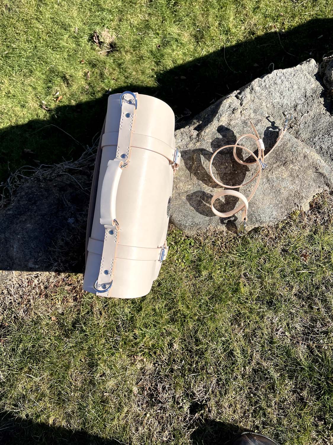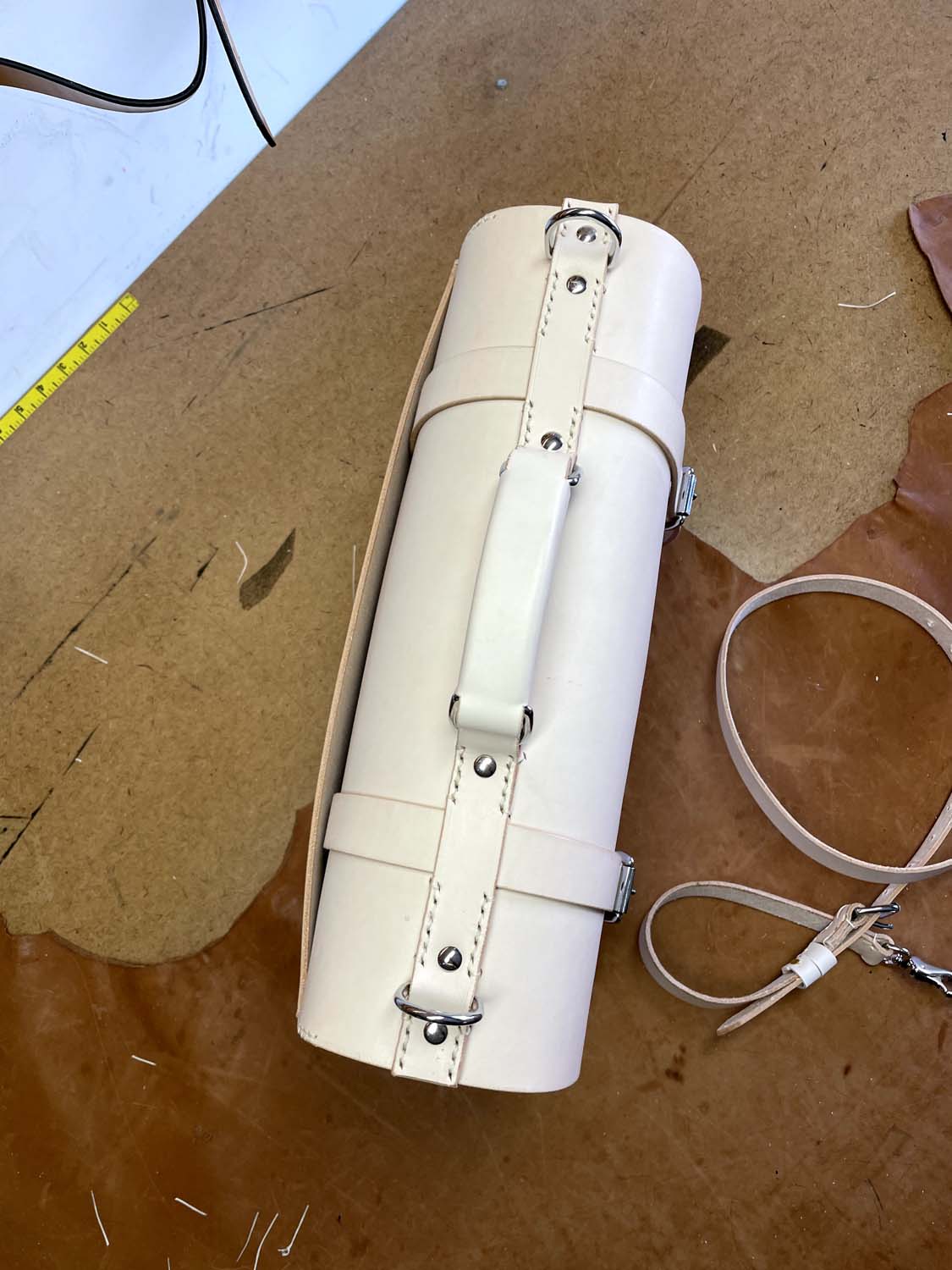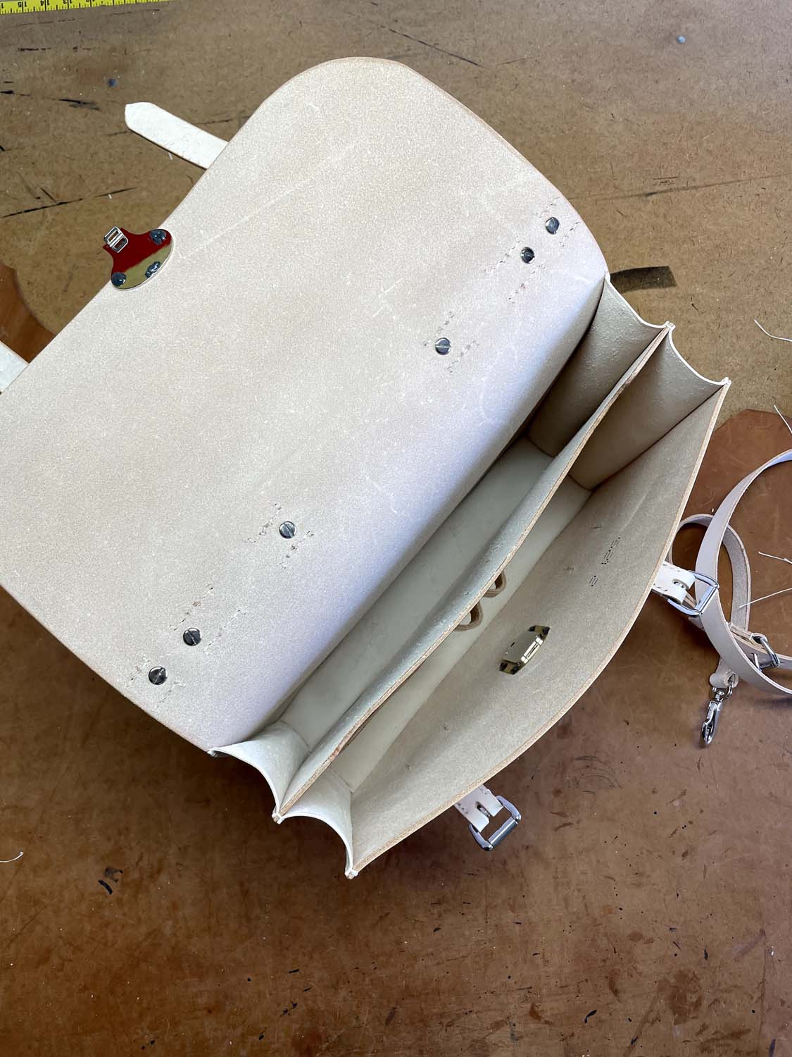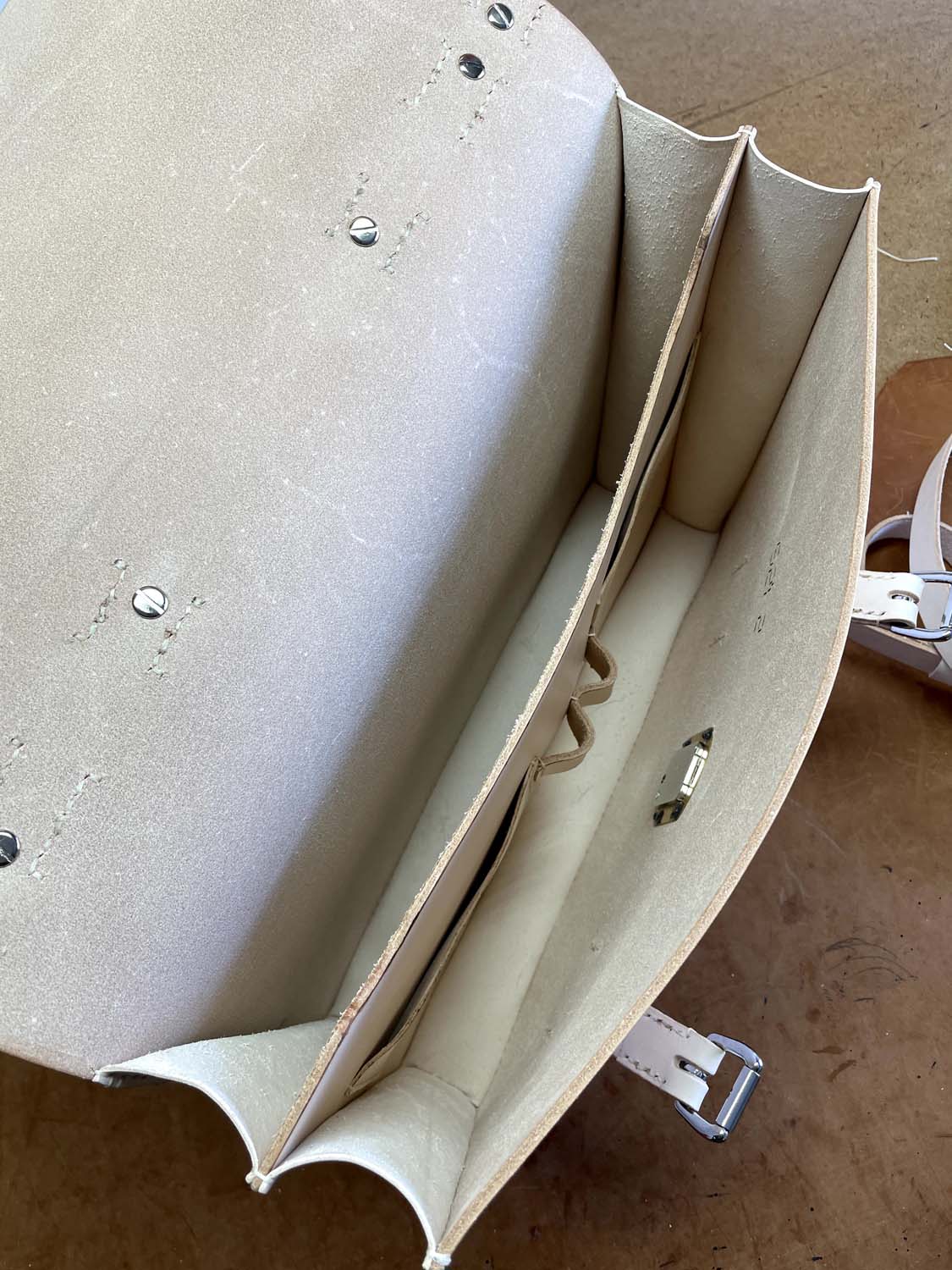 This is all-natural vegetable tanned leather made in my classic Wallace briefcase style that has front removable straps and a center lock, inside pockets, a back news paper pocket and a natural lining.