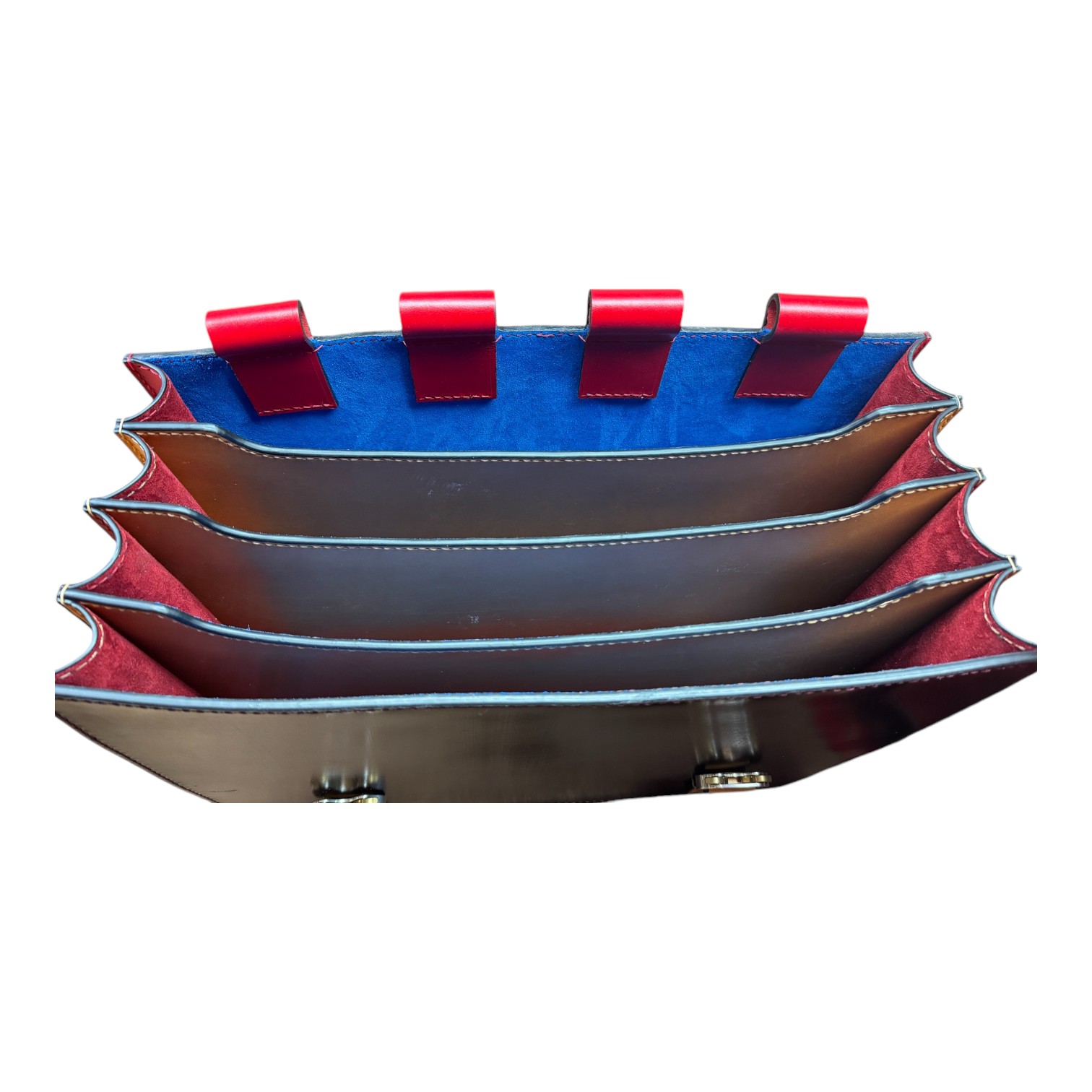 This is a one of my biggest leather briefcases with 4 compartments spanning 8″ with a larger 18″ x 13″ body. This is a thick traditional UK English bridle leather briefcase. The flap opens wide because it is on a wood bar and can be removed if needed. I originally made this style for a doctor / lawyer that wanted to keep this case by his desk and opened. He used it like a file cabinet throughout the day, so it had to stay open wide and close when he went home.